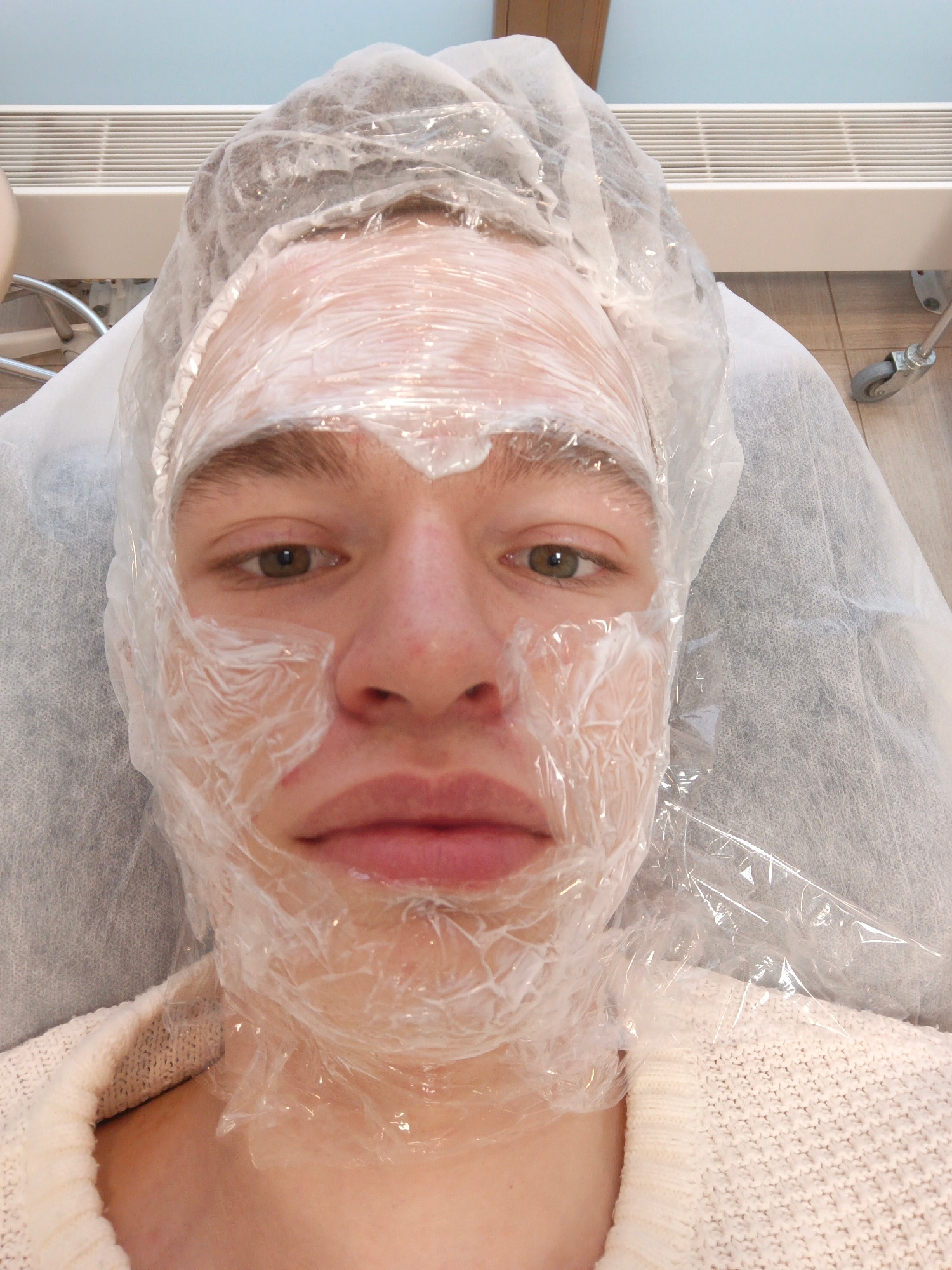 A young, light-skinned person lies on a padded examination table covered with a white disposable sheet. They are wearing a white sweater and have a clear plastic wrap applied over a white substance on…read more