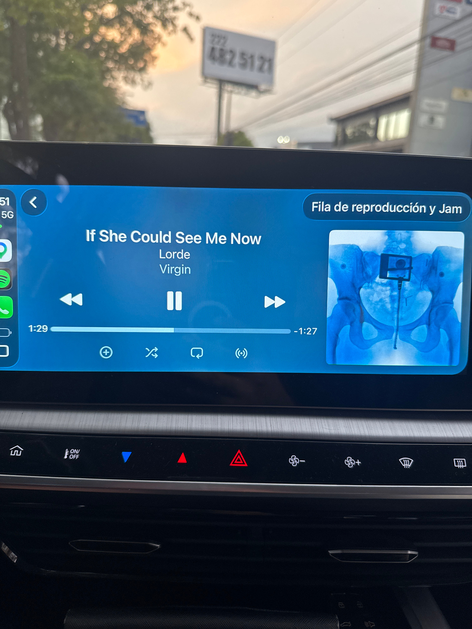 The image shows a car's infotainment screen displaying music playback information. The song "If She Could See Me Now" by Lorde from the album "Virgin" is playing. The cover art is an X-ray of a pelvisβ¦read more