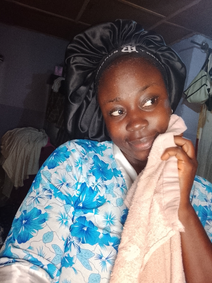A young woman poses indoors wearing a blue and white floral robe and a black satin bonnet with a logo on the front band. She holds a light pink towel up to her face, partially obscuring it. The room iā¦read more