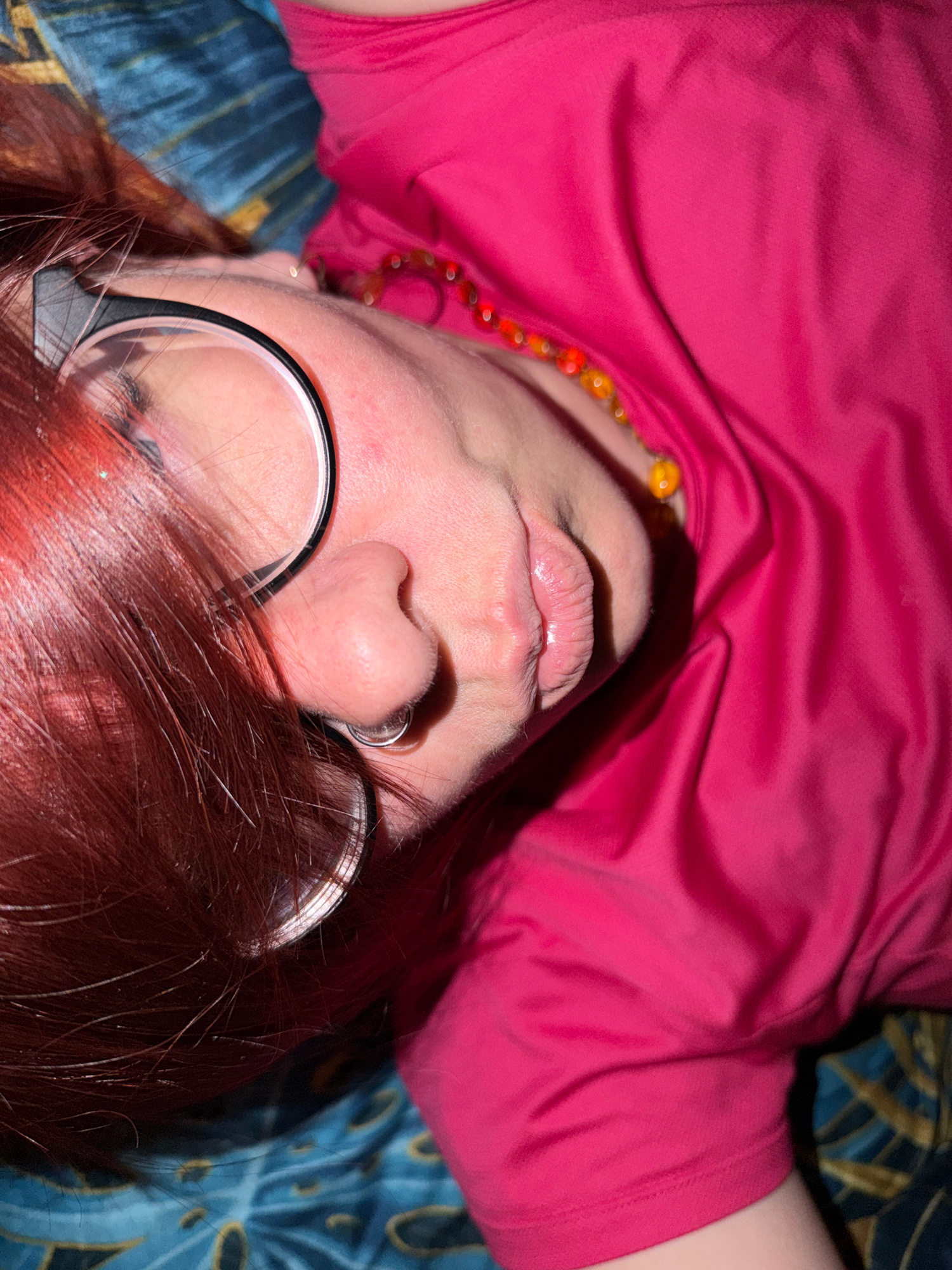 A close-up, angled view of a person with red hair, wearing glasses and a pink shirt. They are lying on a patterned blue and gold surface. A beaded necklace is partially visible. The image provides no…read more