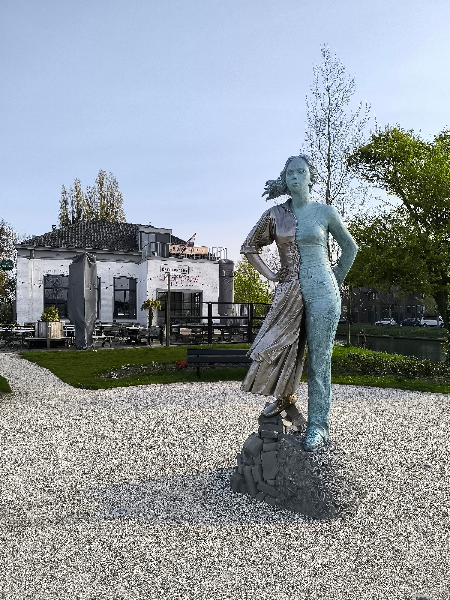 A statue stands in a park in Alkmaar, Netherlands. The statue depicts a woman with a dual appearance: the left side of her body is rendered in silver and depicts her wearing a dress, while the right s…read more
