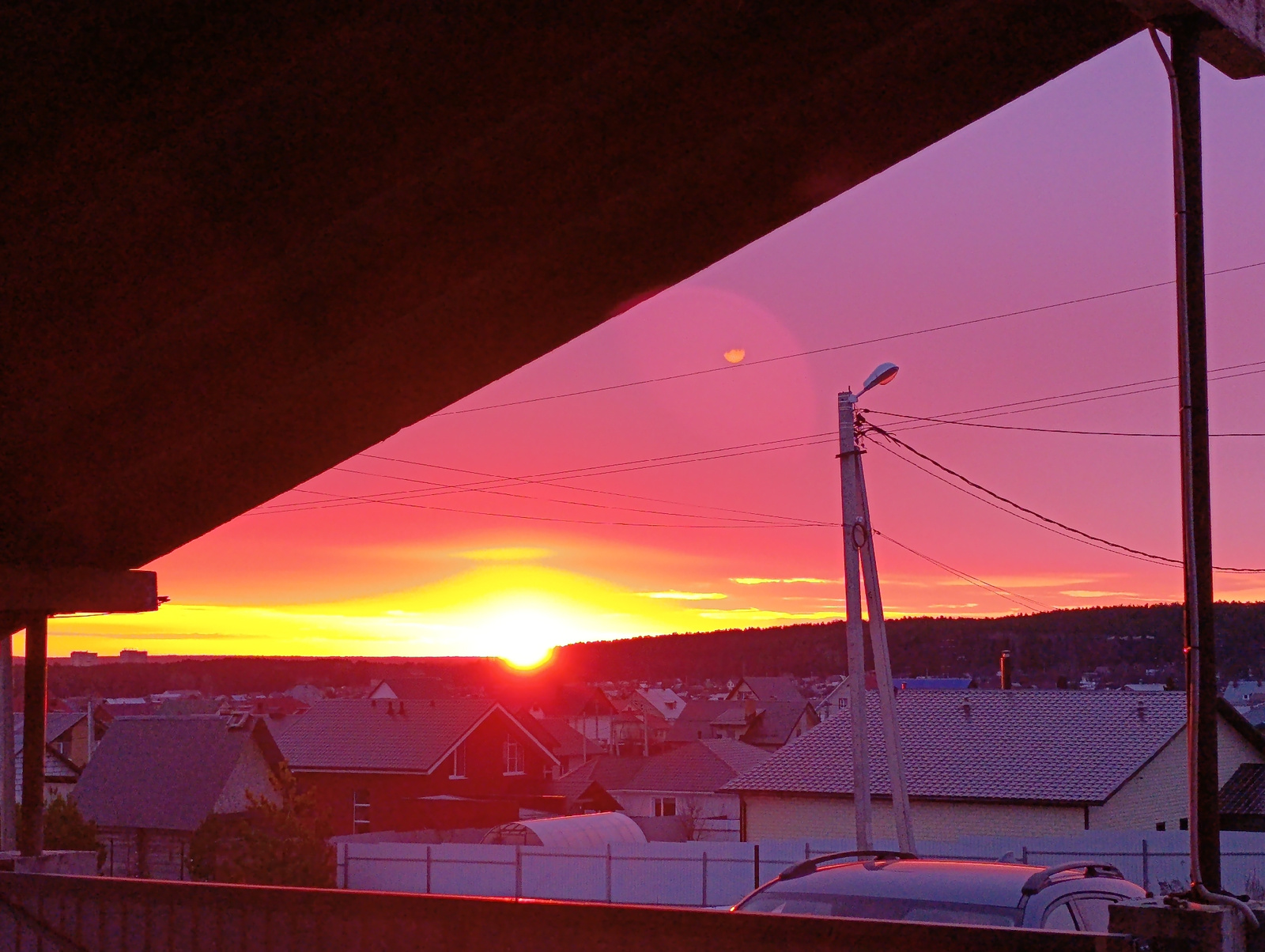 The image captures a vibrant sunset in the city of Chaikovsky, Russia. The view is framed by a dark overhanging structure, possibly a balcony or the edge of a building. Below, a residential area is vi…read more