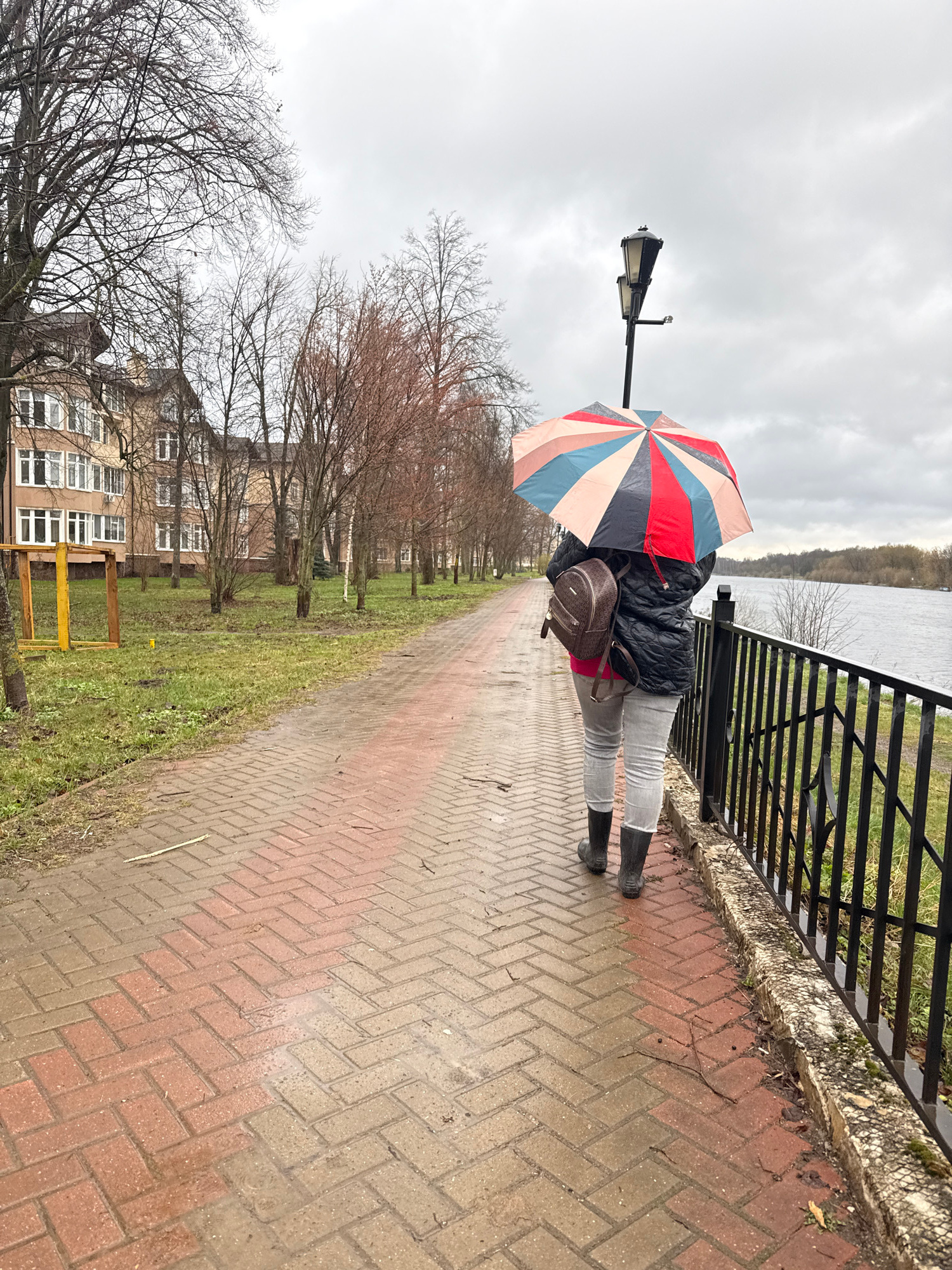 This image, taken in Dmitrov, Russia, depicts an outdoor scene on an overcast day, likely during late autumn or winter given the bare deciduous trees. The photograph is oriented sideways, but if viewe…read more