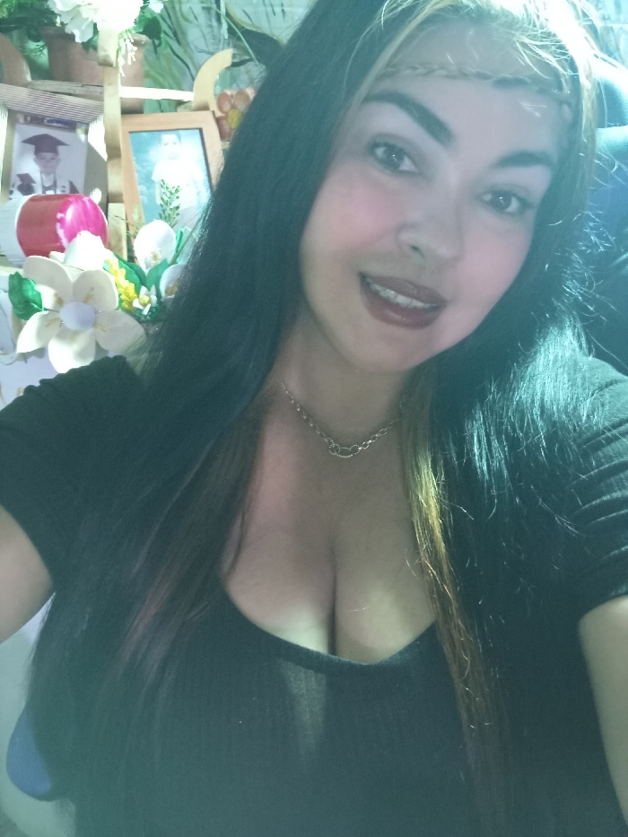 A woman poses in a black low-cut top, displaying a silver chain necklace and a headband. Her dark hair is streaked with blonde highlights. Background details include pictures in wooden frames, a red jā¦read more