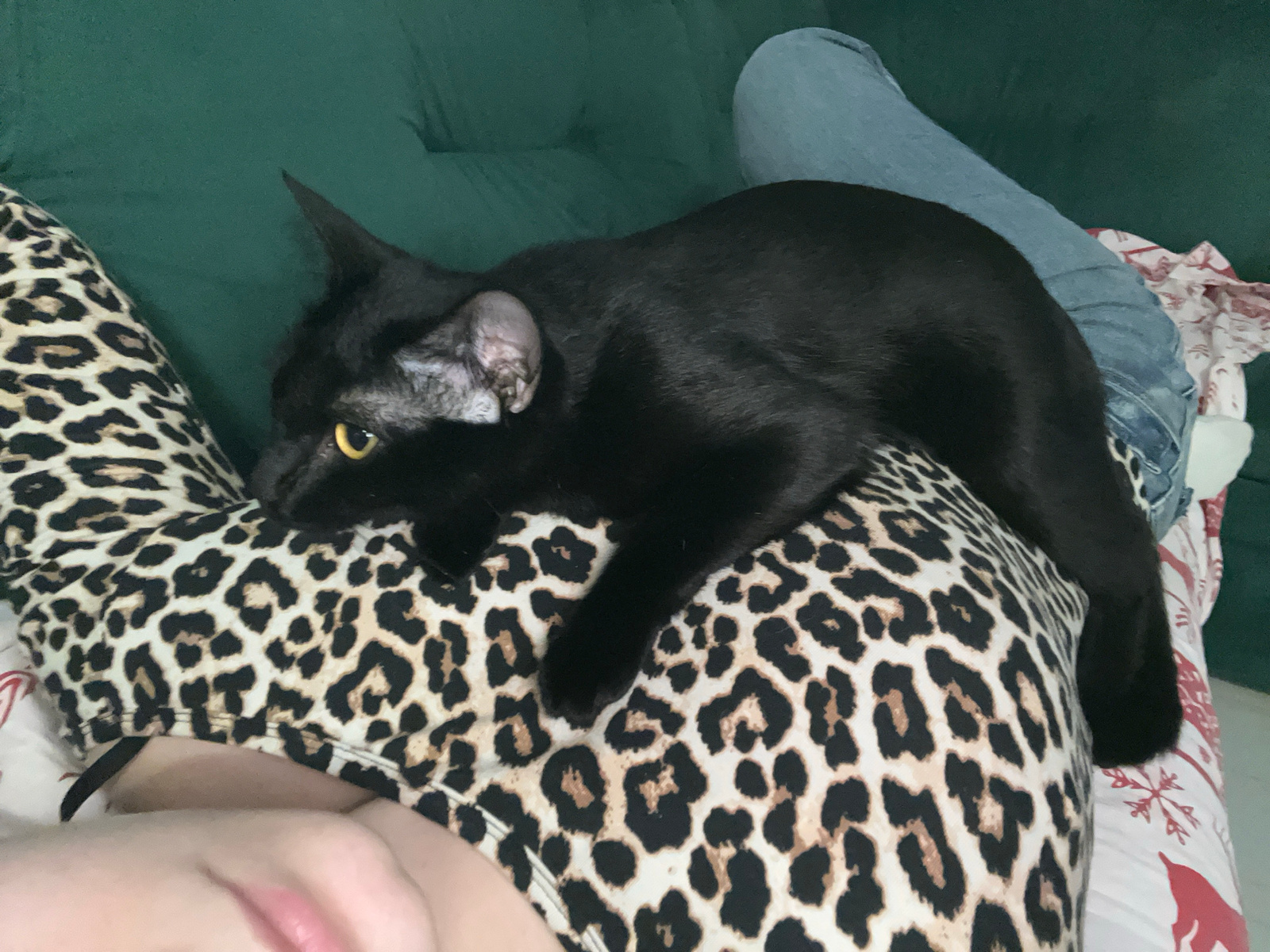 A black cat is lying on a person's lap. The person is wearing a leopard-print top and blue jeans. The cat's yellow eyes are visible. The background shows a green couch and a bed with a white and red p…read more