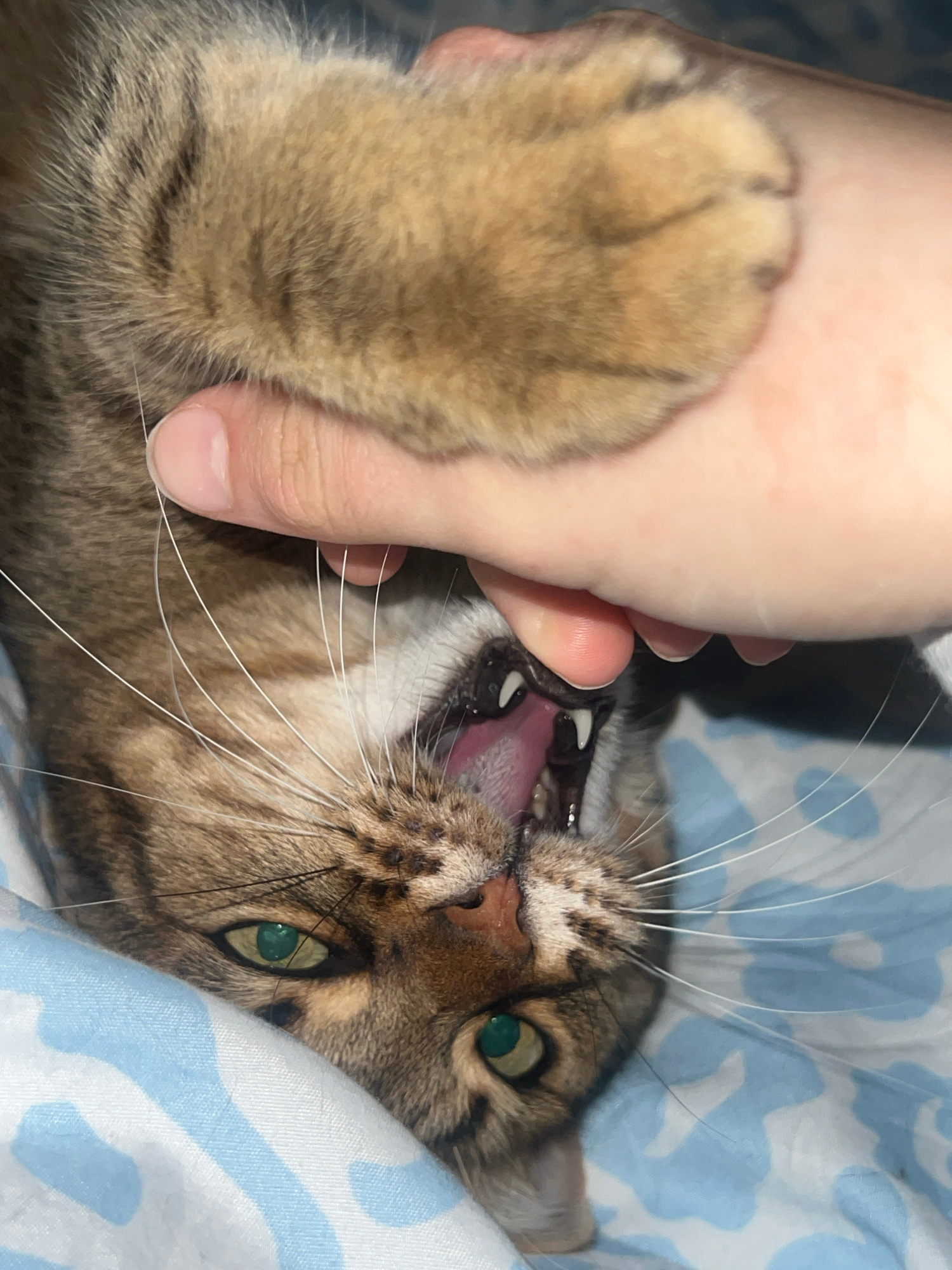 A close-up shot depicts a domestic tabby cat lying on a blue and white patterned fabric, possibly a bedsheet. The cat's mouth is open, revealing its teeth and tongue, and a human hand is partially visβ¦read more