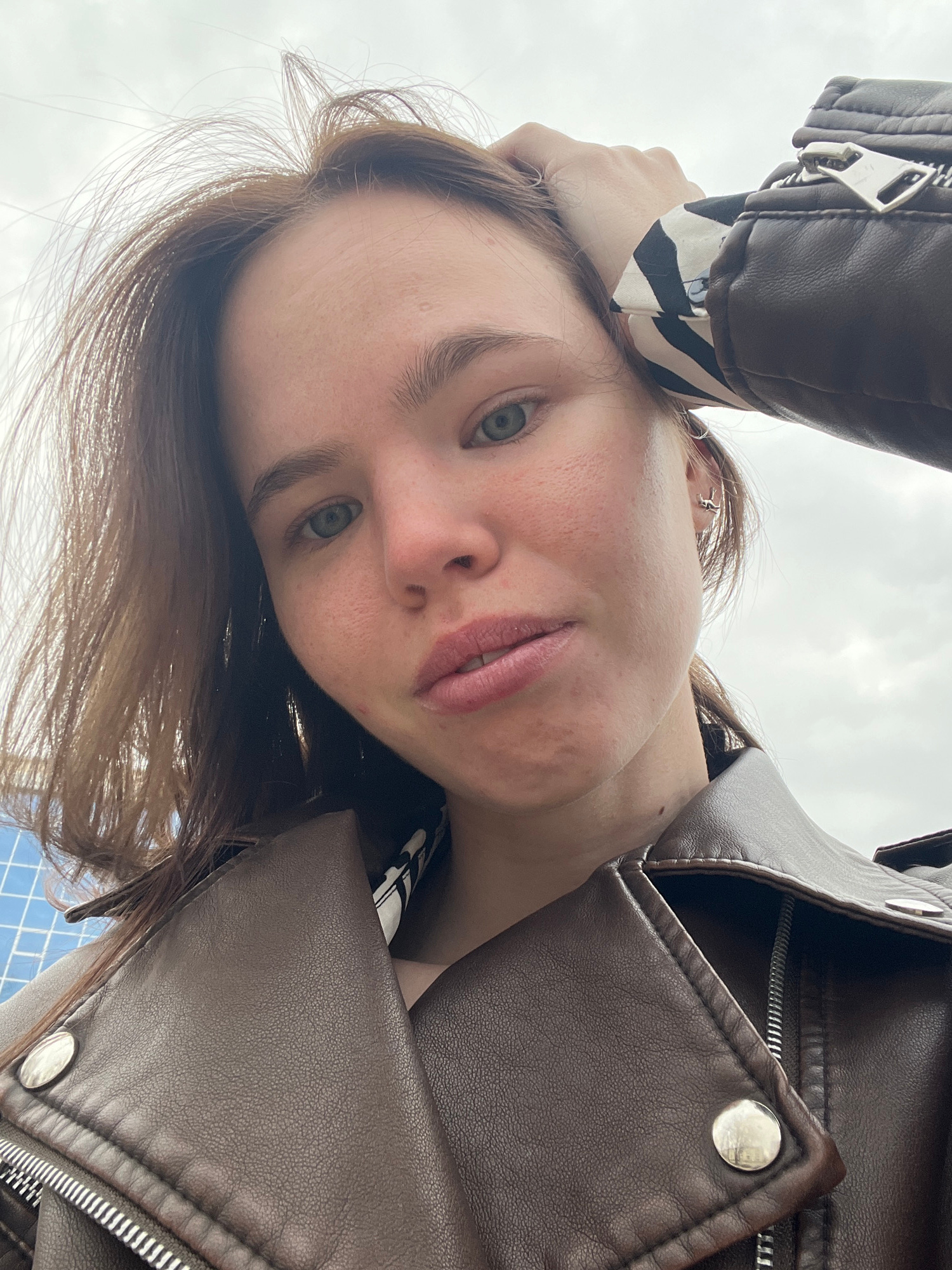 The image is an upward-angled, rotated selfie of a young woman, taken in Chaikovsky, Russia. Her face is in the center, looking directly at the camera with a neutral to slightly pensive expression. Sh…read more