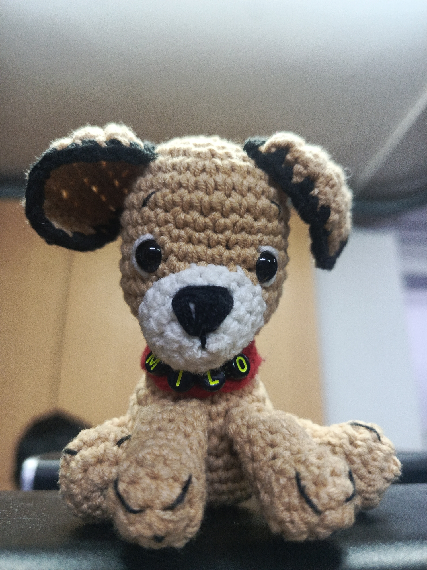 A close-up, low-angle shot shows a tan crocheted dog with black eyes and a white muzzle. The dog wears a red collar with black letters spelling "MILO". The background is blurry, but appears to be an i…read more