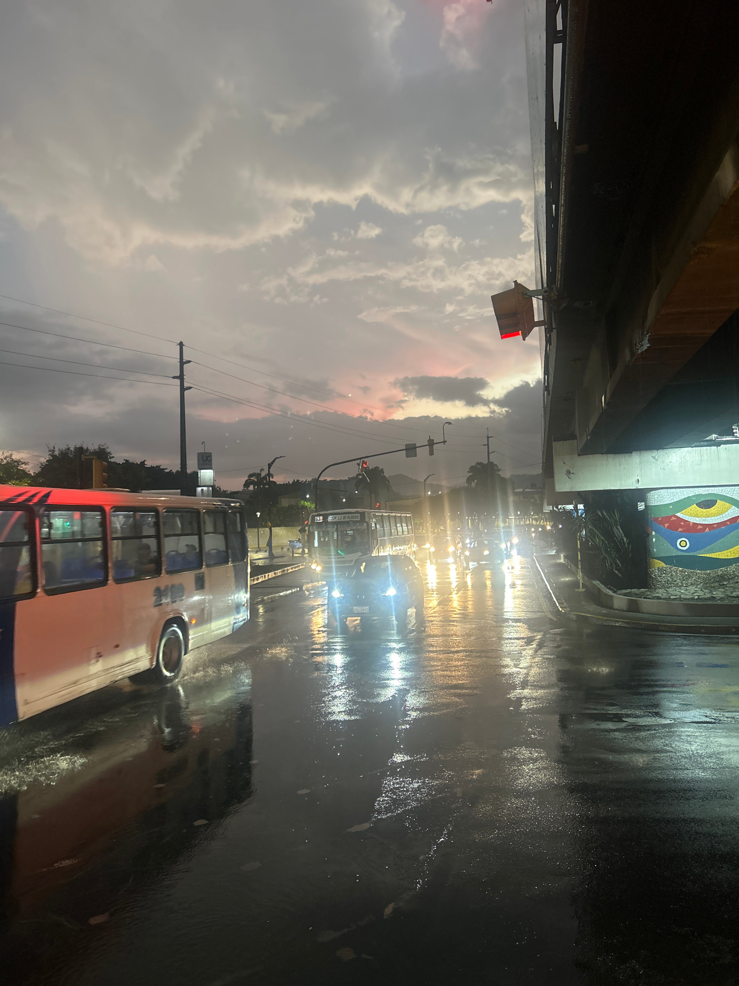 This media file captures an urban street scene in Guayaquil, Ecuador, at dusk or early evening, following a rainfall. The street is wet and highly reflective, mirroring the bright lights of vehicles a…read more