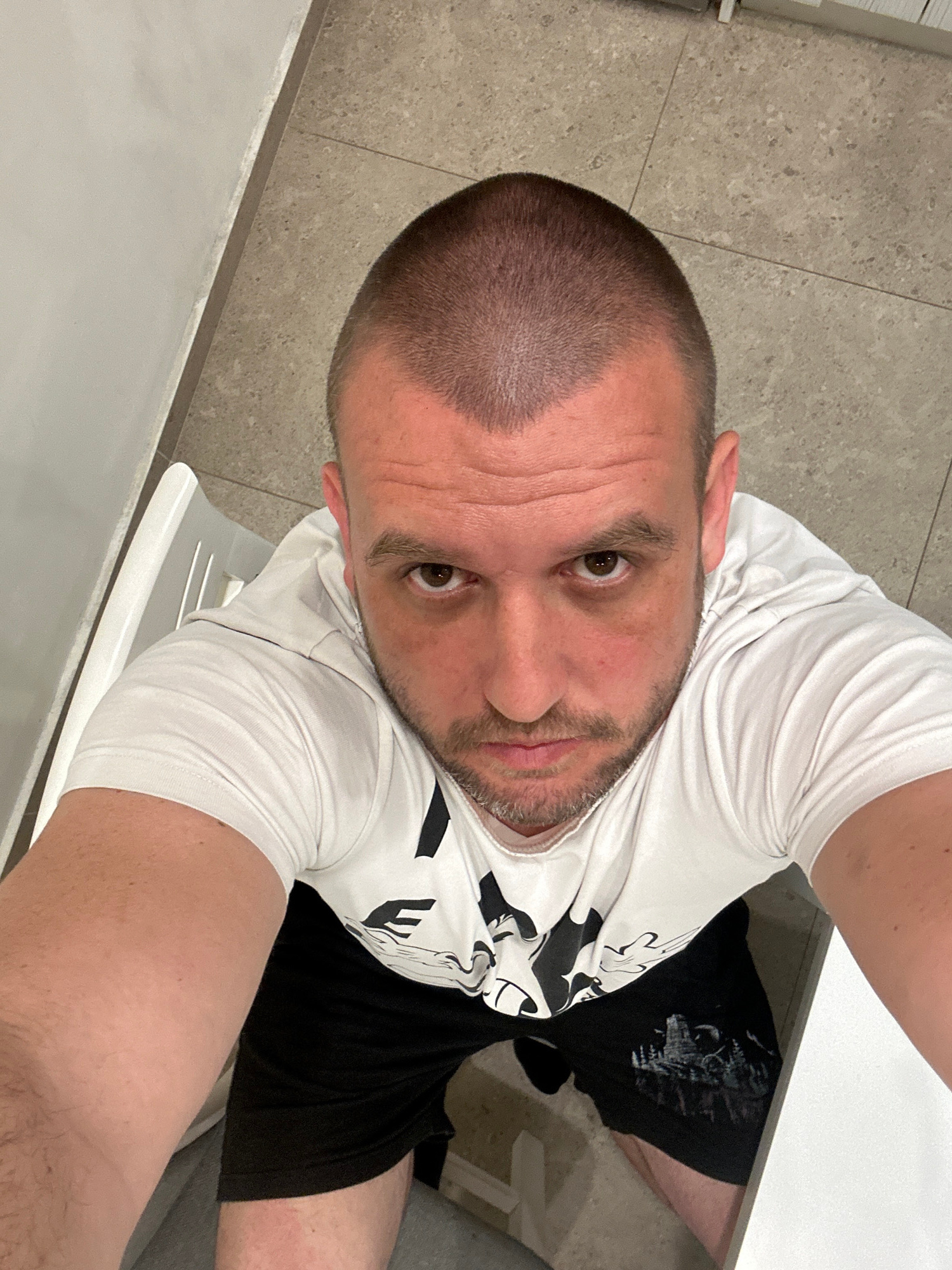 A man is sitting indoors, likely in an apartment or office. He is fair-skinned with a shaved head and a trimmed beard. He is wearing a white t-shirt with a design and black shorts. He is seated on a w…read more