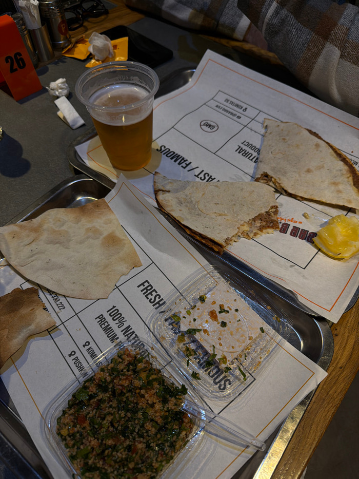 Two metal trays hold various food items. The first tray contains pieces of flatbread, a slice of lemon, and a drink in a clear plastic cup. The second tray features two clear plastic containers holdin…read more