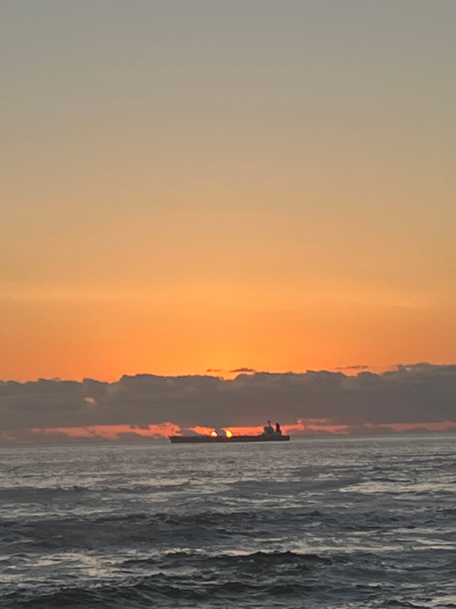 The image shows a seascape at sunset, likely near Arica, Chile given the request. The right side of the image contains water with visible wave patterns. Towards the center, the sun appears on the hori…read more