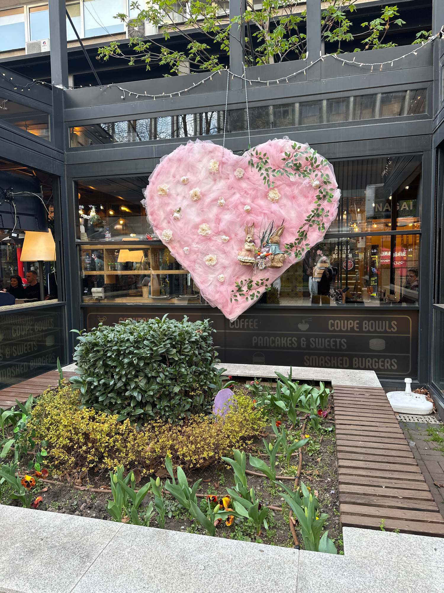 Here's a forensic description of the image: The image shows an exterior scene in what appears to be a commercial area. A large, pink heart-shaped decoration hangs in front of a restaurant or cafe. Th…read more