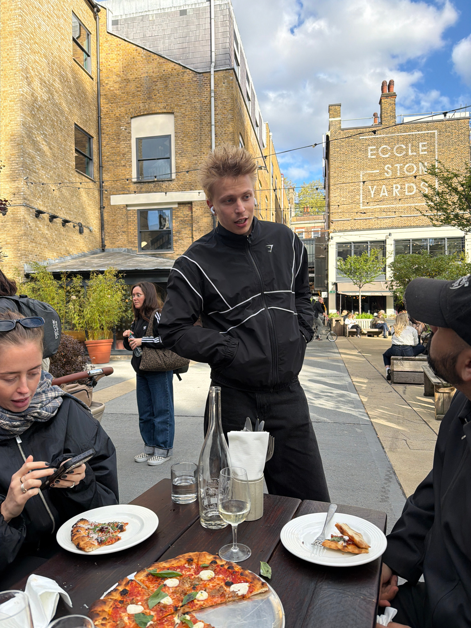 The image shows an outdoor dining scene. A partially consumed pizza and appetizer plates sit on a dark wooden table with empty wine glasses and a wine bottle. Four people are partially visible around…read more