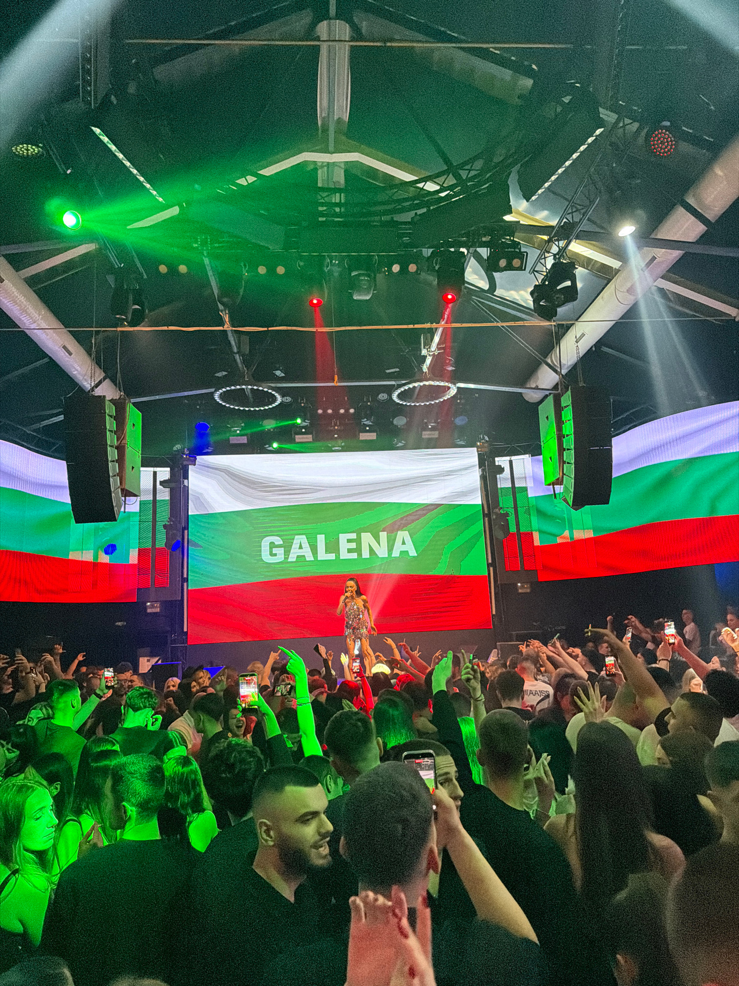 The image captures a live performance featuring the artist "Galena" in Burgas, Bulgaria. The backdrop is a large display showing the Bulgarian flag with "GALENA" written vertically in the white stripeβ¦read more
