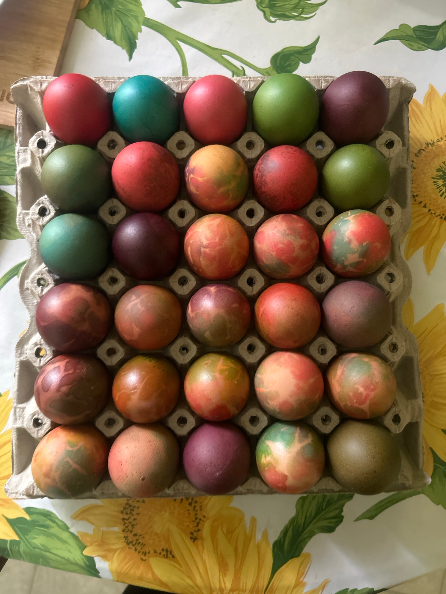 A top-down view shows a cardboard egg carton containing 30 dyed Easter eggs arranged in a 5x6 grid. The eggs are colored in various shades of red, green, purple, brown, and blue. Some eggs have a mott…read more