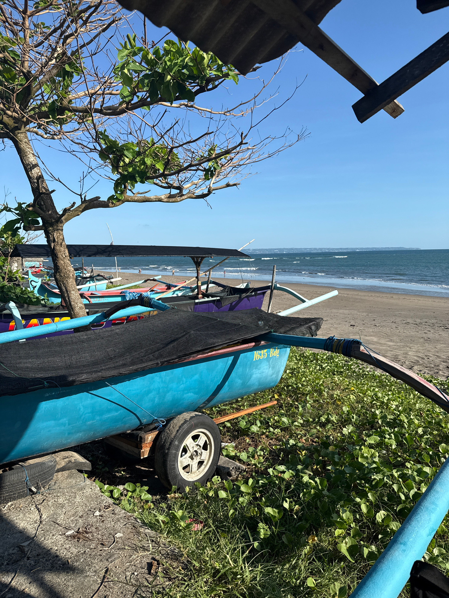 The image captures a blue outrigger boat, possibly a Jukung, resting on a trailer with a wheel near the coast in North Kuta, Indonesia. The beach, a dark sandy stretch meeting the ocean, is visible in…read more