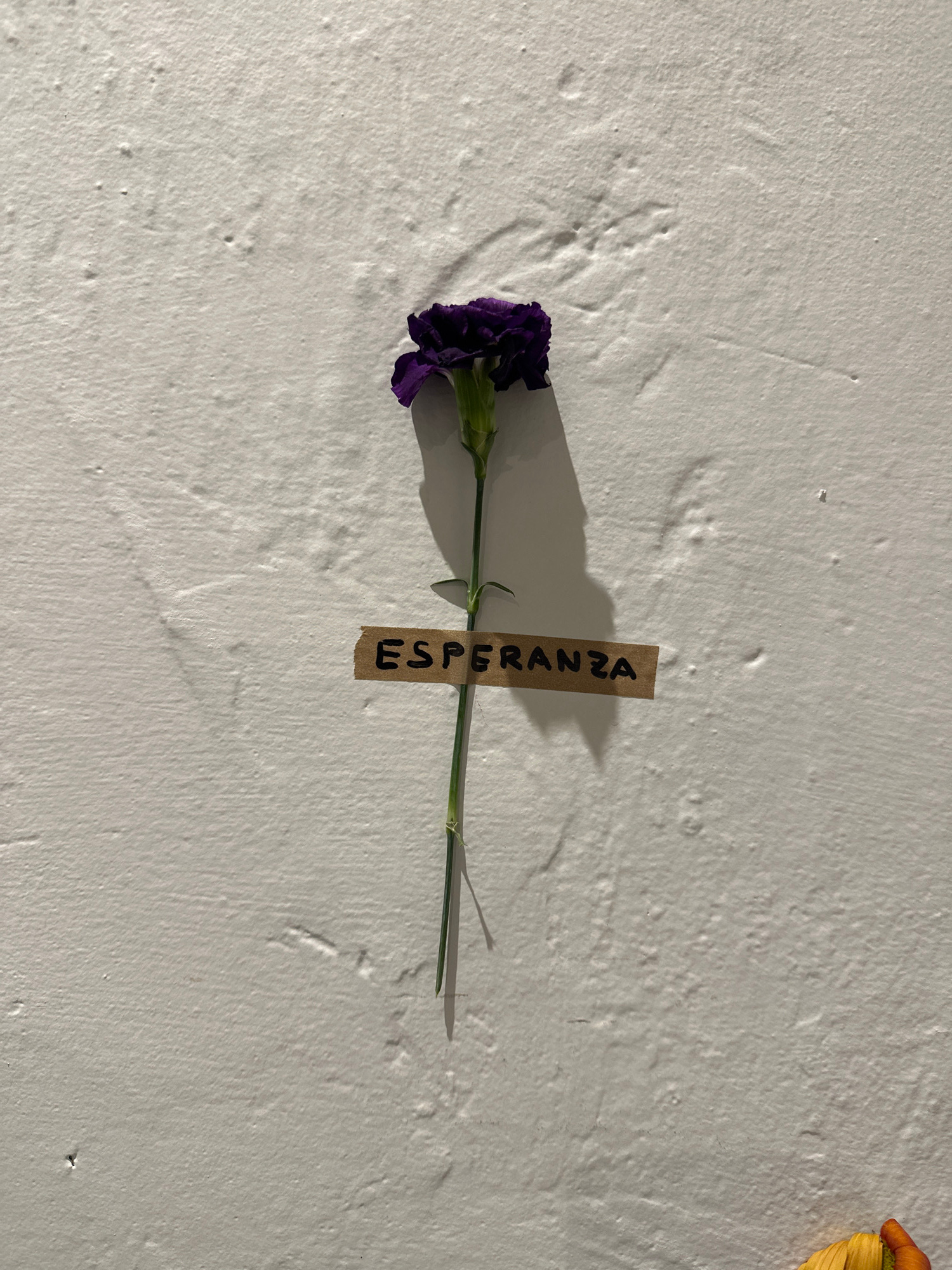 A single dark purple carnation with a green stem is affixed to a textured white wall with a small piece of brown tape. The word "ESPERANZA" (Spanish for hope) is written vertically on the tape in blac…read more