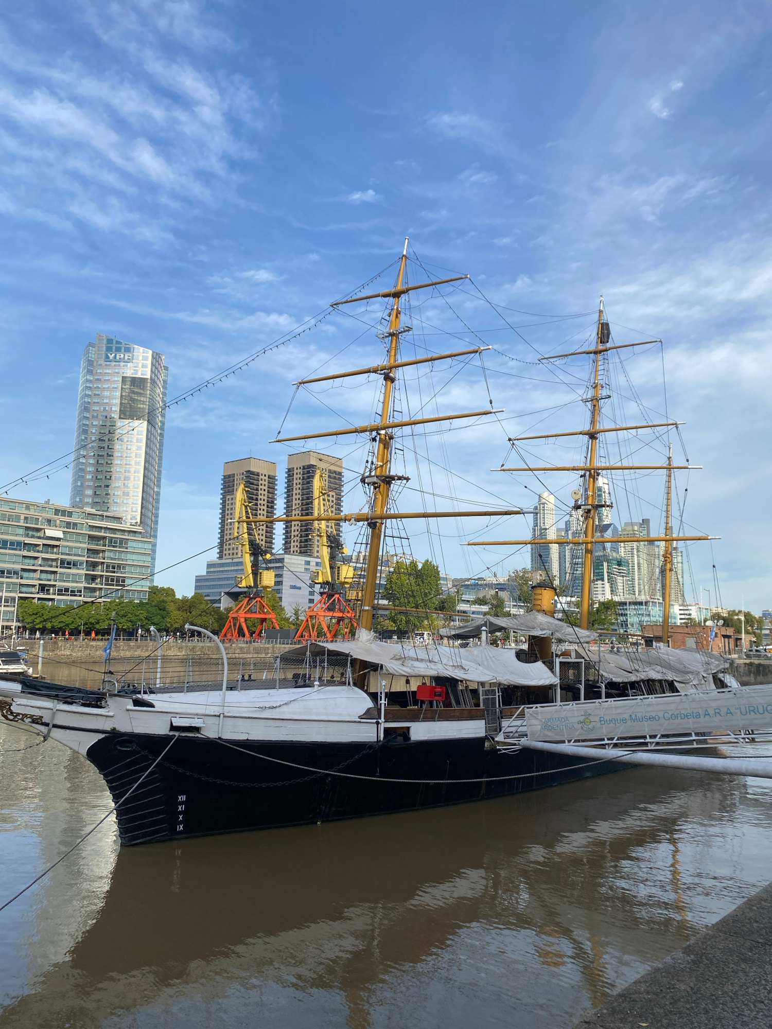 The image depicts a large, black and white tall ship docked in the city of Buenos Aires, Argentina, with the masts extending high into the blue sky. The ship's hull is reflected in the murky water, anβ¦read more