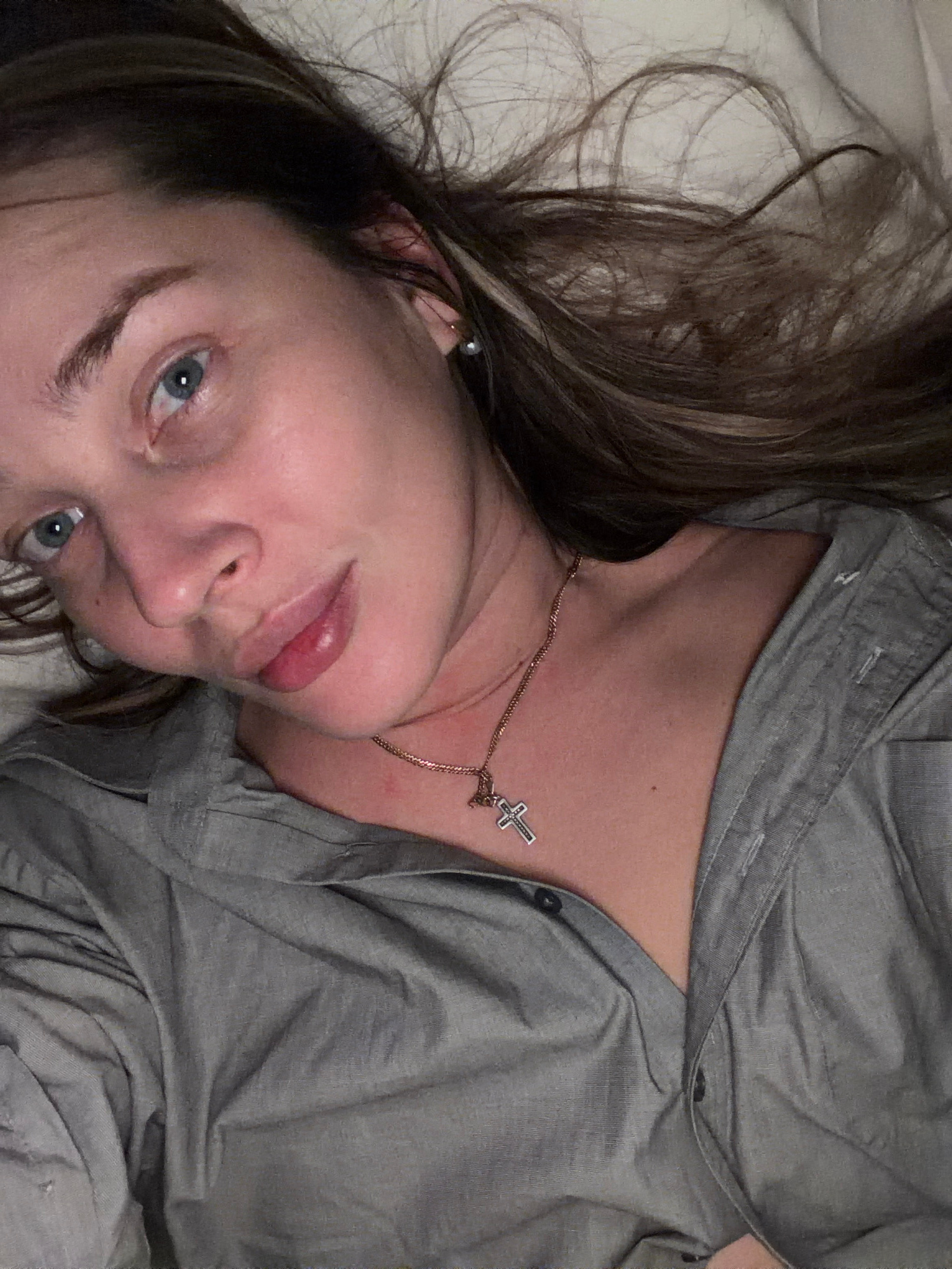 A woman lies on her back wearing a gray collared shirt and a gold necklace with a cross pendant. She has fair skin, blue eyes, and light brown hair with blonde highlights. She appears to be indoors, p…read more