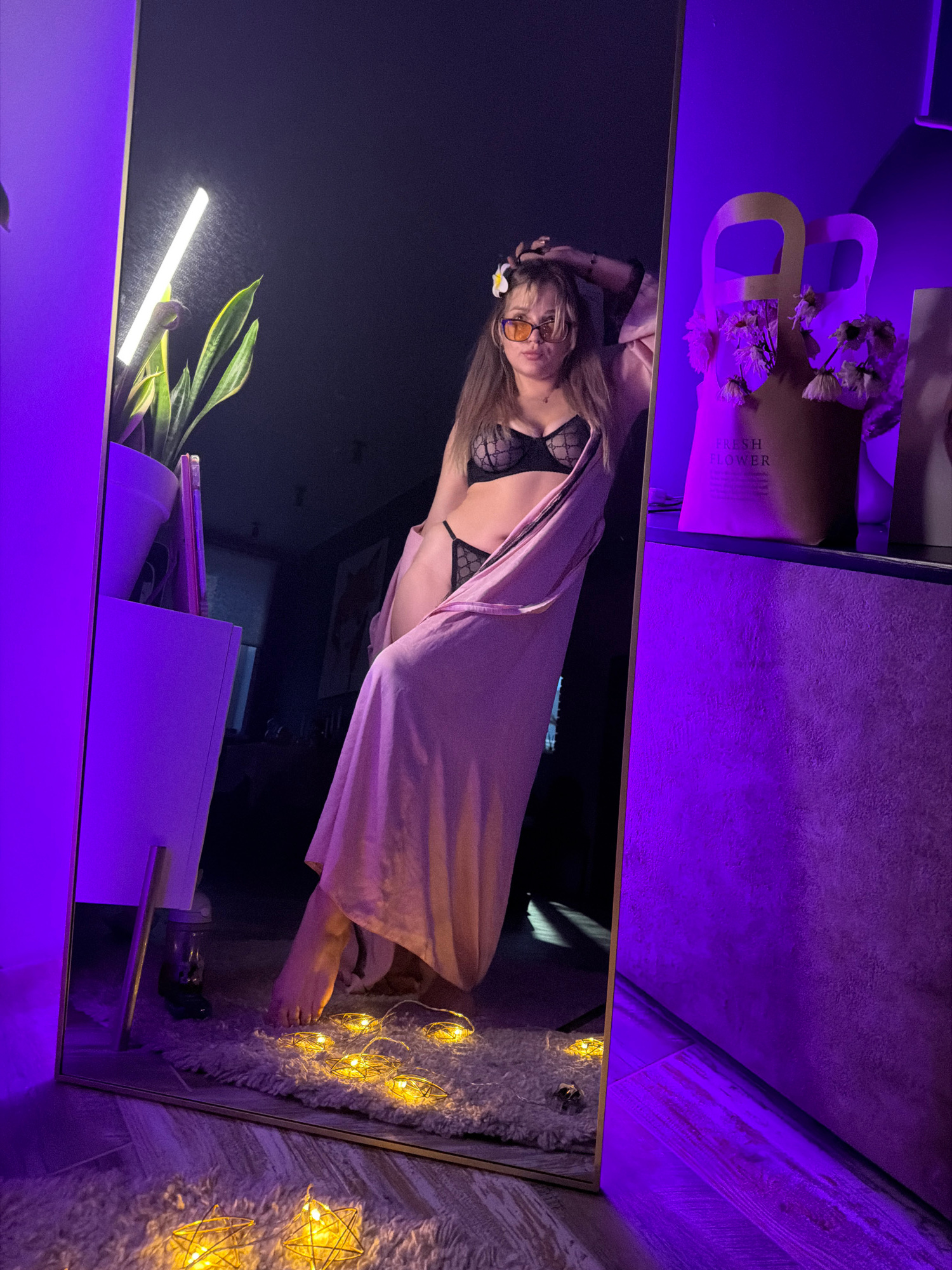 A reflection in a mirror shows a woman with long hair wearing a black lace bra and a pink robe. She is standing on a fluffy white rug with star-shaped string lights. To the left of the reflection are…read more