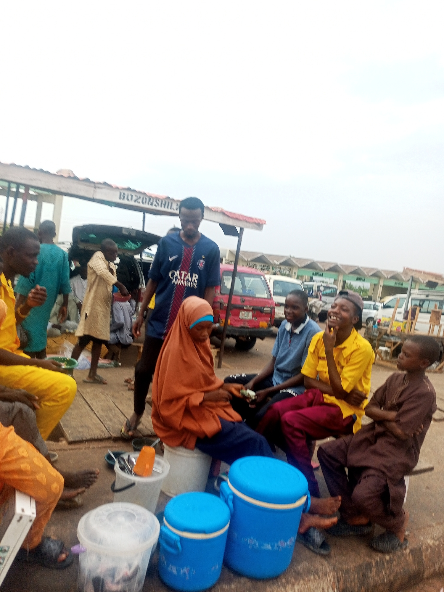 The image depicts a group of people gathered in Gombe, Nigeria. There are men, women, and children present. The scene appears to be an outdoor market or gathering place. The sign "BOZONSHILI" is visibβ¦read more