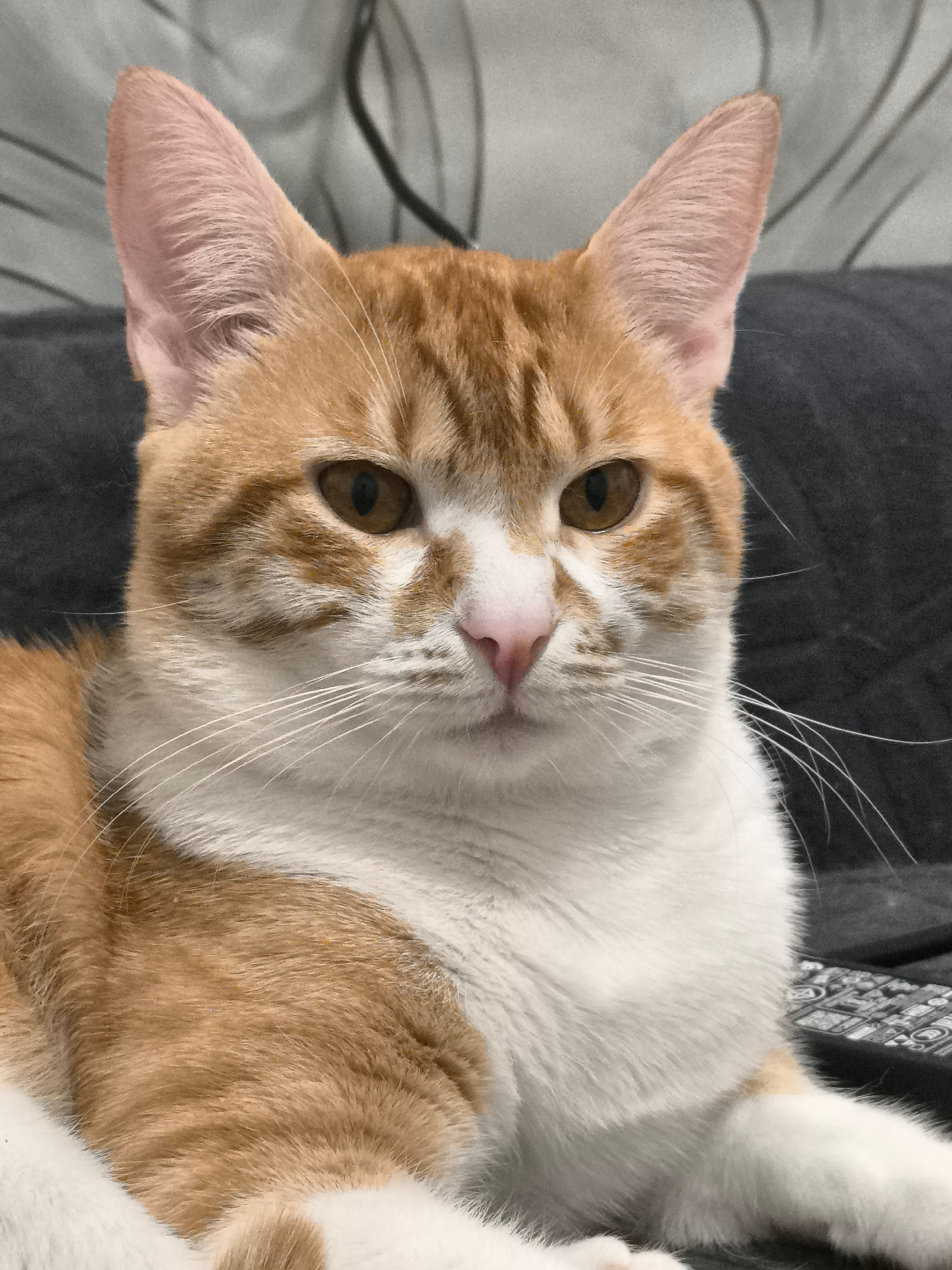 A close-up portrait of an orange and white cat. The cat has amber eyes, pink ears and nose, and is resting on a grey surface. A television remote is visible in the lower right corner of the frame. The…read more