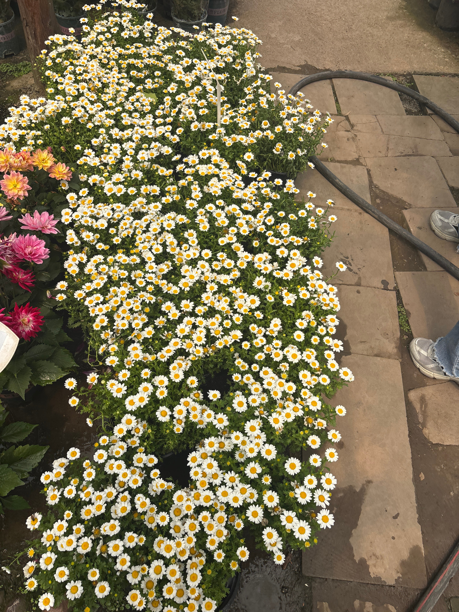 The scene is a garden area, potentially in Yongchuan, China. The image shows a collection of daisies with white petals and yellow centers, densely packed together. A section of brick pavers are visibl…read more