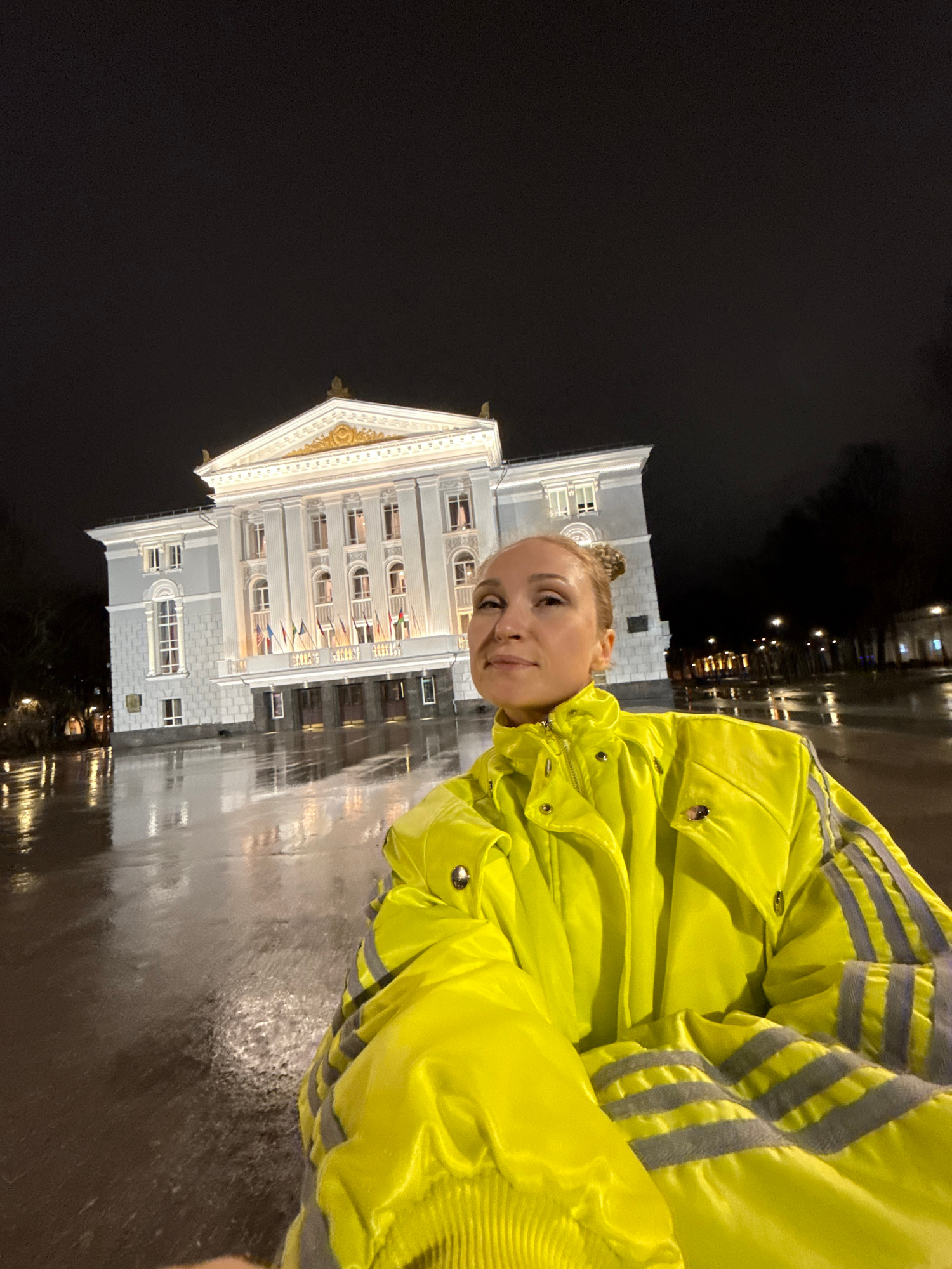 A woman wearing a yellow jacket is in front of the Perm Opera and Ballet Theatre. The photograph was taken at night, and the ground appears wet. The building is brightly lit and has a classical archit…read more