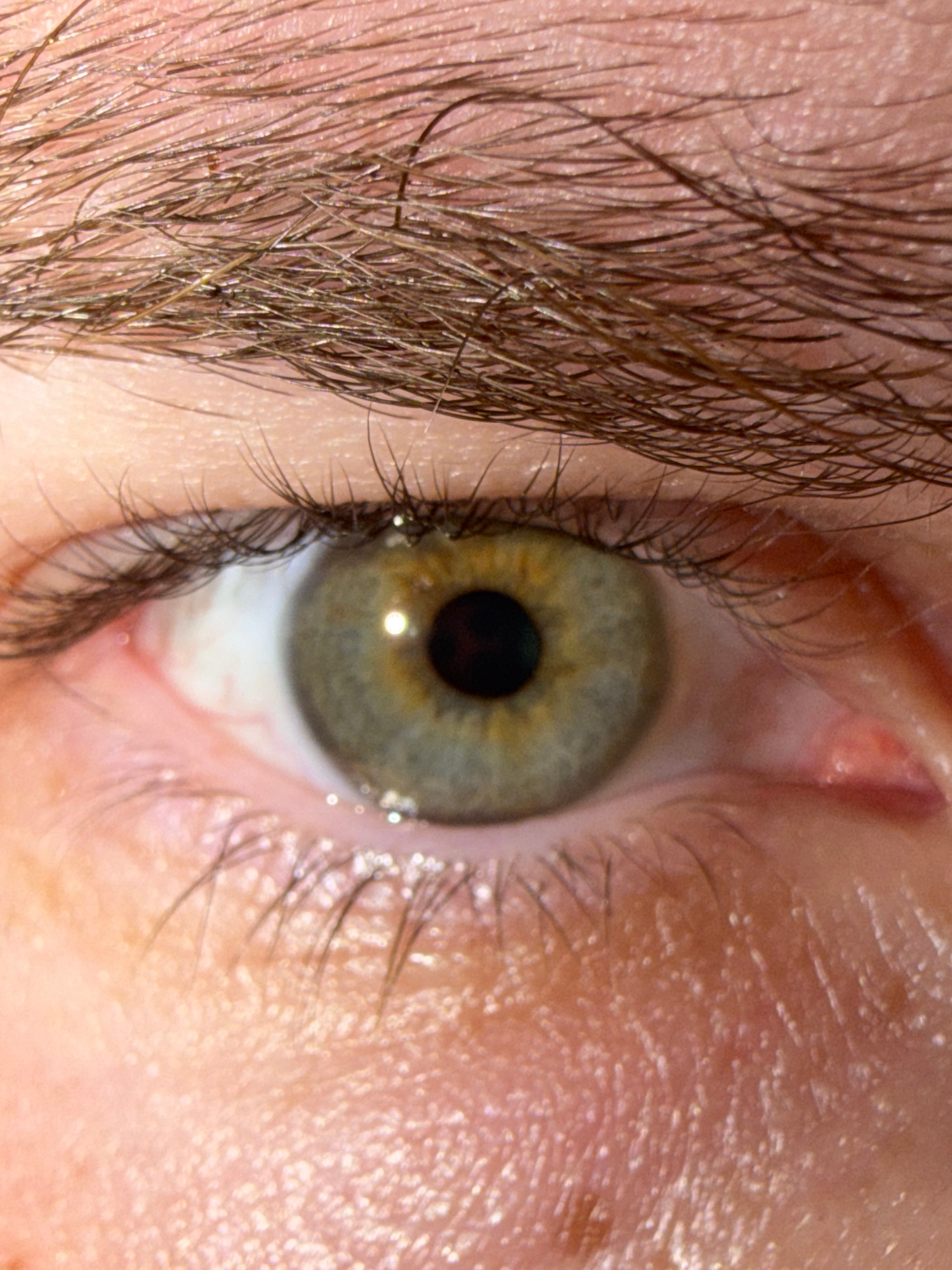 A close-up image shows a human eye with a light green iris and dark pupil. The skin around the eye is visible, with eyelashes extending outward. The left side of the image shows the edge of a person's…read more