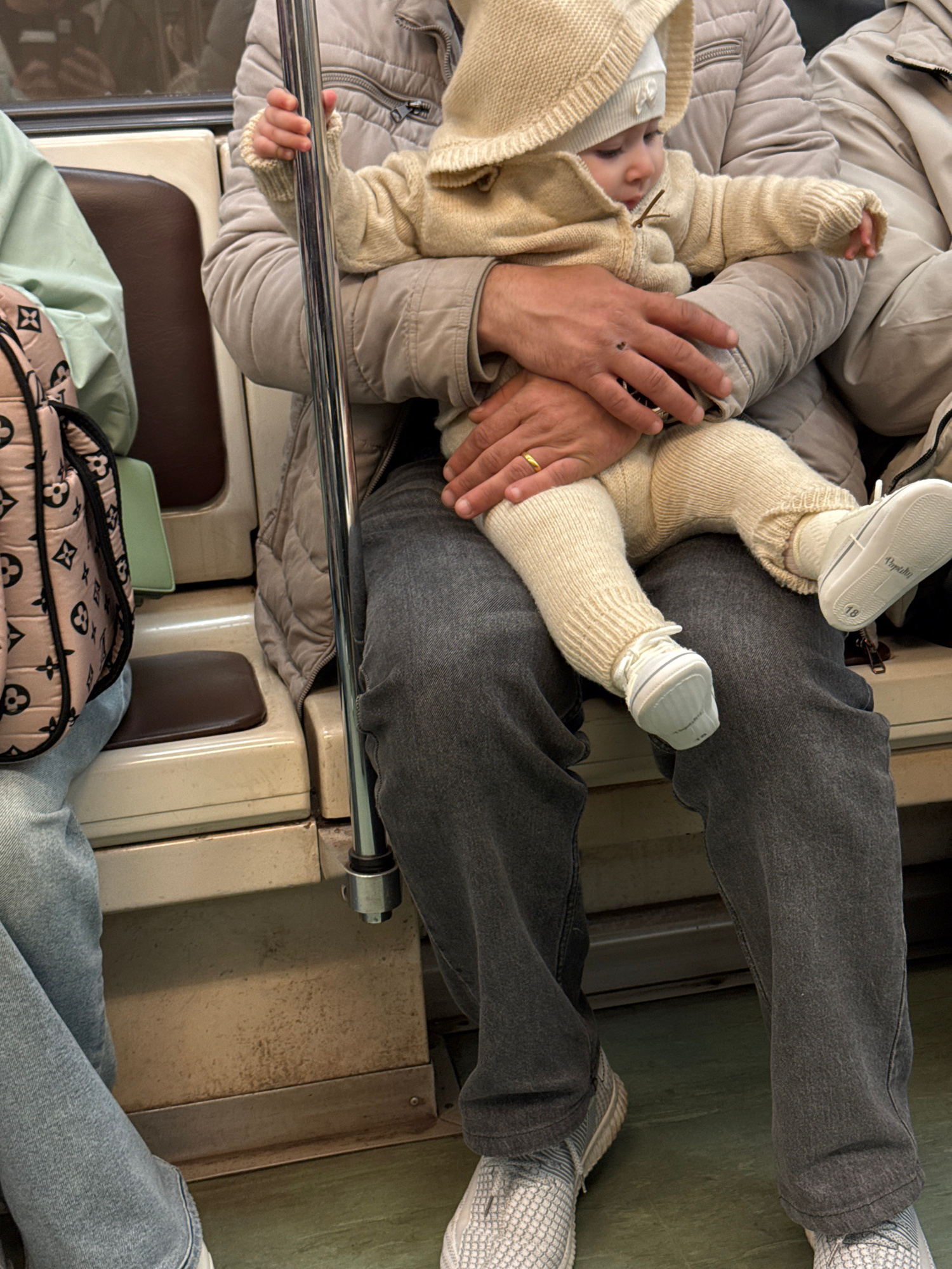 A top-down indoor shot shows a baby lying on an adult's lap, likely in the Moscow Metro, Russia. The baby is dressed in a beige knit hooded cardigan, hat, socks, and white baby shoes. The adult is wea…read more