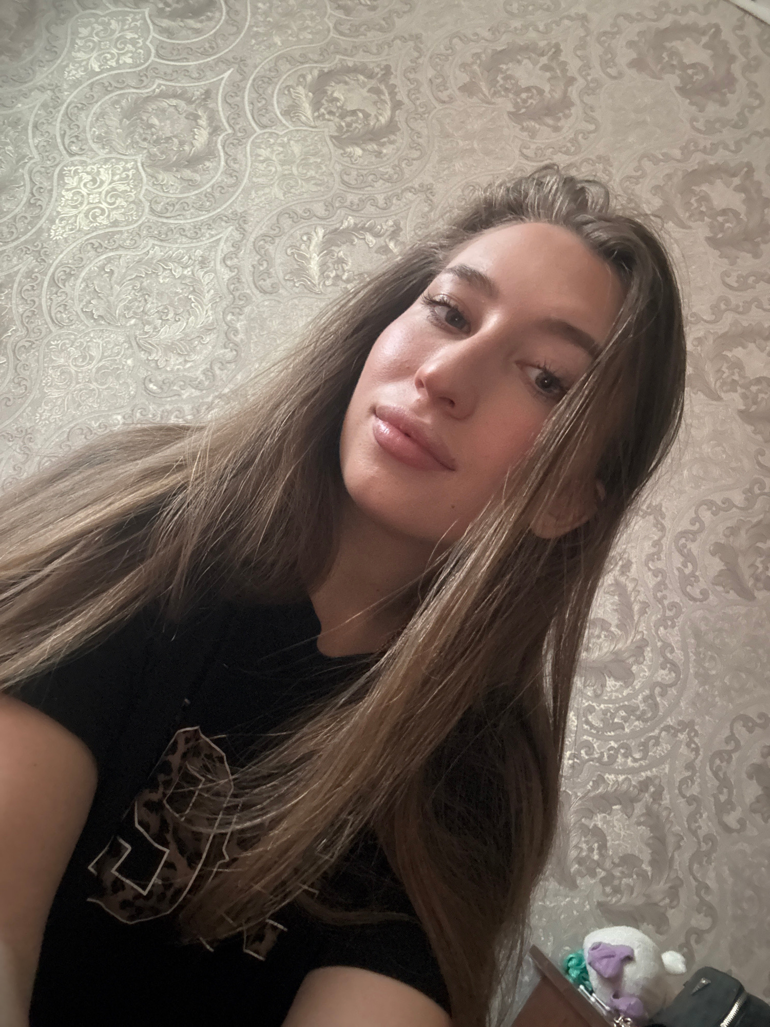 A young woman with long, light brown hair is facing the camera. She is wearing a black shirt. Behind her is a wallpaper with a repetitive, ornate pattern. A stuffed animal is in the background to theβ¦read more