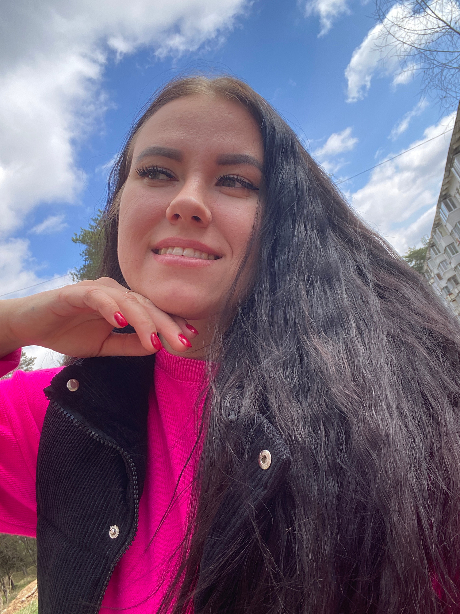 A woman with long dark hair is smiling at the camera. She is wearing a bright pink sweater and a black jacket. Her left hand is near her face. The background shows a blue sky with white clouds and a p…read more