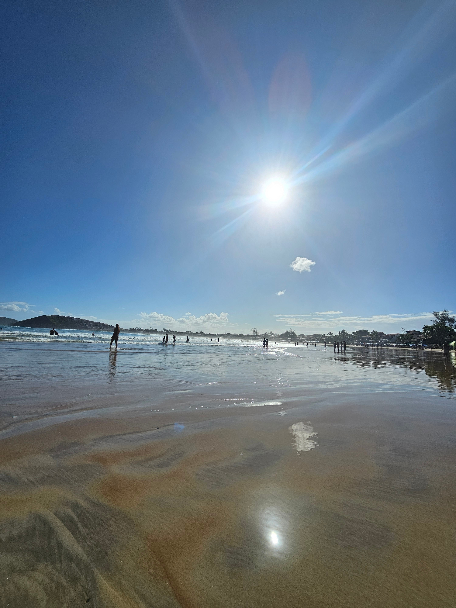 The image depicts a beach scene in Armação dos Búzios, Brazil, with a clear blue sky and bright sunlight. The wet sand reflects the sky and sunlight, creating a mirror-like effect. Several people are…read more