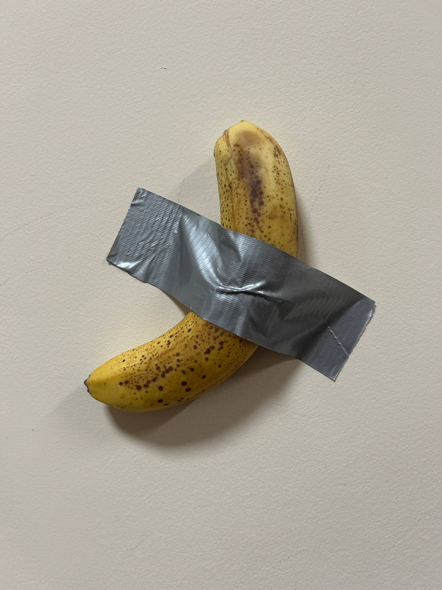 The image shows a banana taped to a wall with gray duct tape. The banana is ripe, with brown spots. The wall is a light beige color. The location of this image is not Razlog, Bulgaria, it is simply a…read more