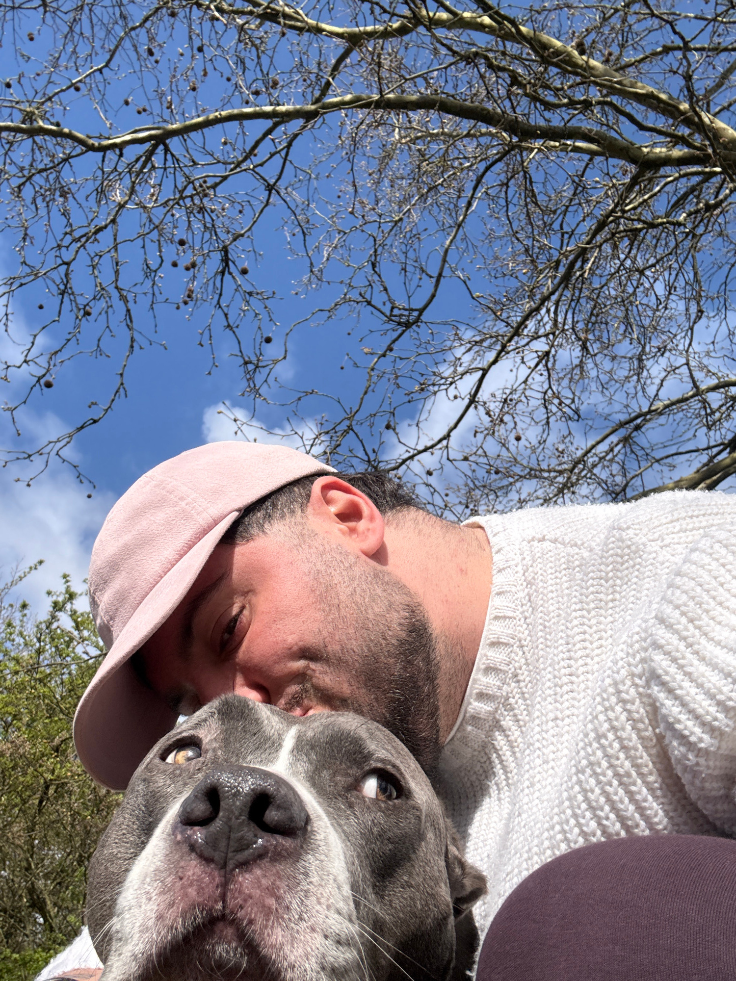 A tilted, close-up photograph shows a man and a dog. The man wears a white sweater and a pink cap. He has a beard and his face is close to the dog's. The dog is gray and white, with its face prominent…read more