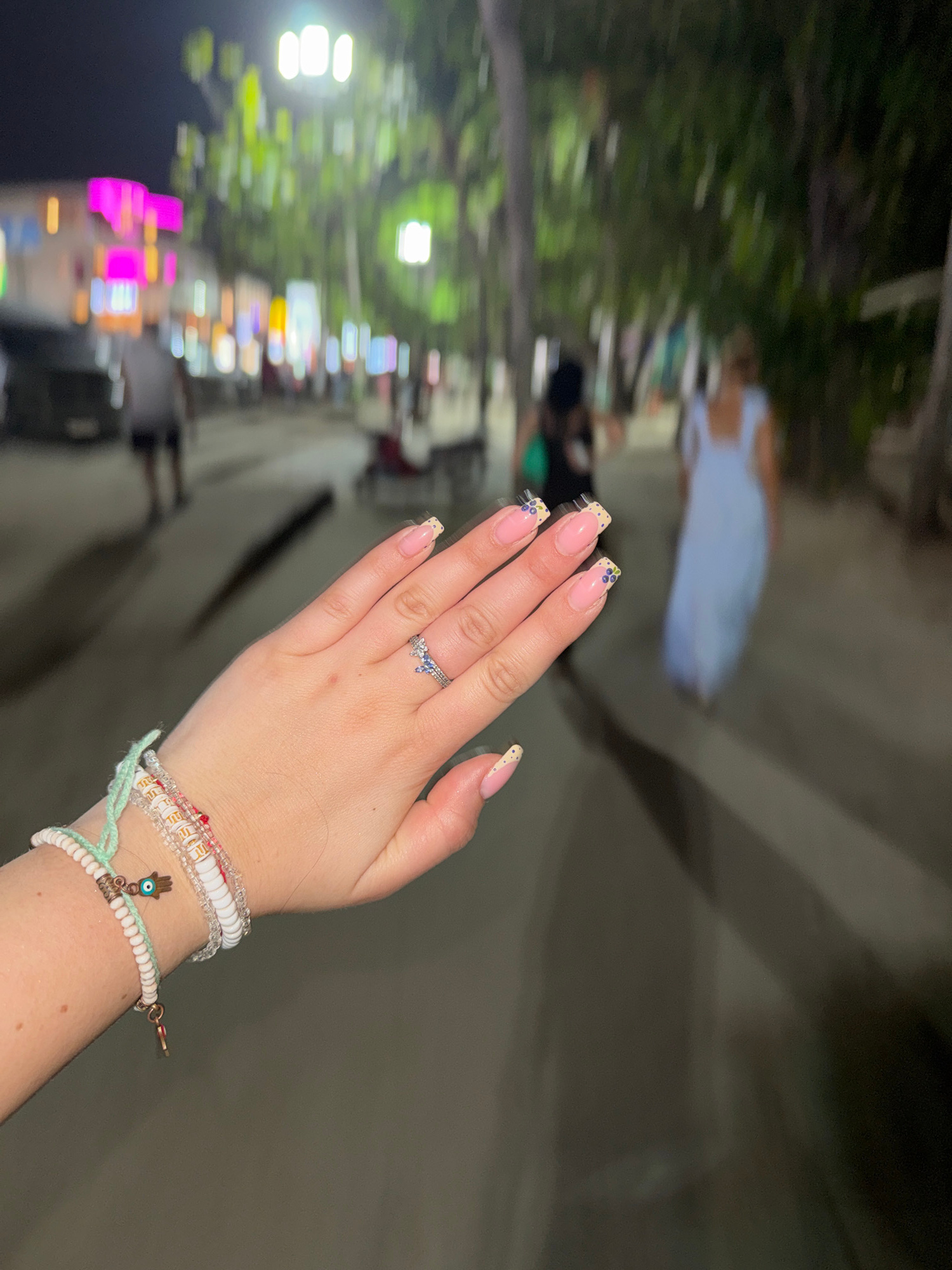 A person's right hand is prominently displayed, adorned with a ring on the ring finger and bracelets on the wrist. The ring appears to have a silver band with possible gemstones. The bracelets are bea…read more