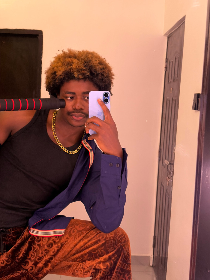 An individual, appearing to be male with dark skin and two-toned afro-textured hair (dark brown with lighter highlights), is captured in an indoor mirror selfie in Igboefon, Nigeria. He displays a neu…read more