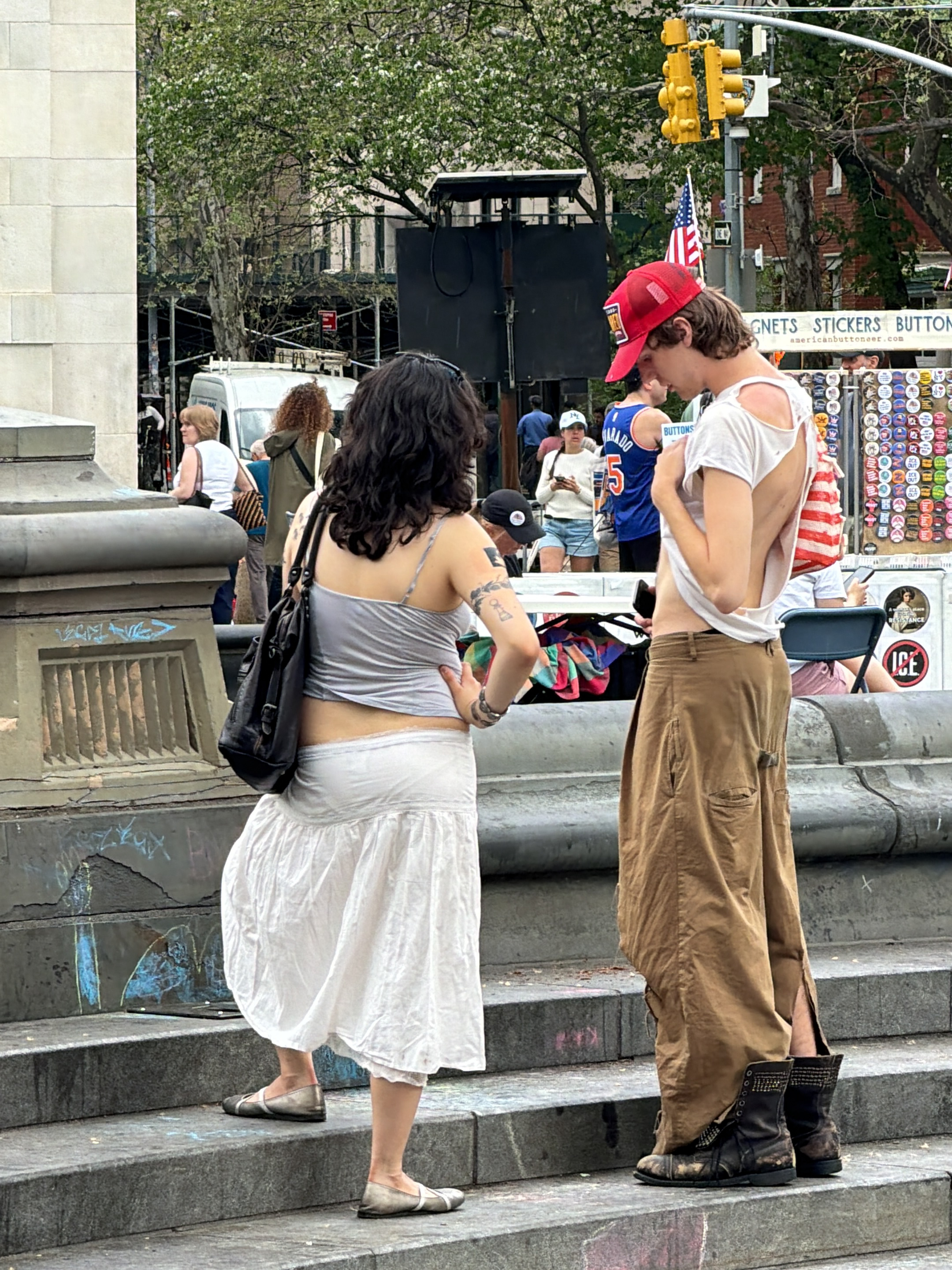 The image shows two people engaged in a conversation on a stone platform with steps, located in Washington Square Park, New York City, United States. The woman on the left has dark, wavy hair and is w…read more