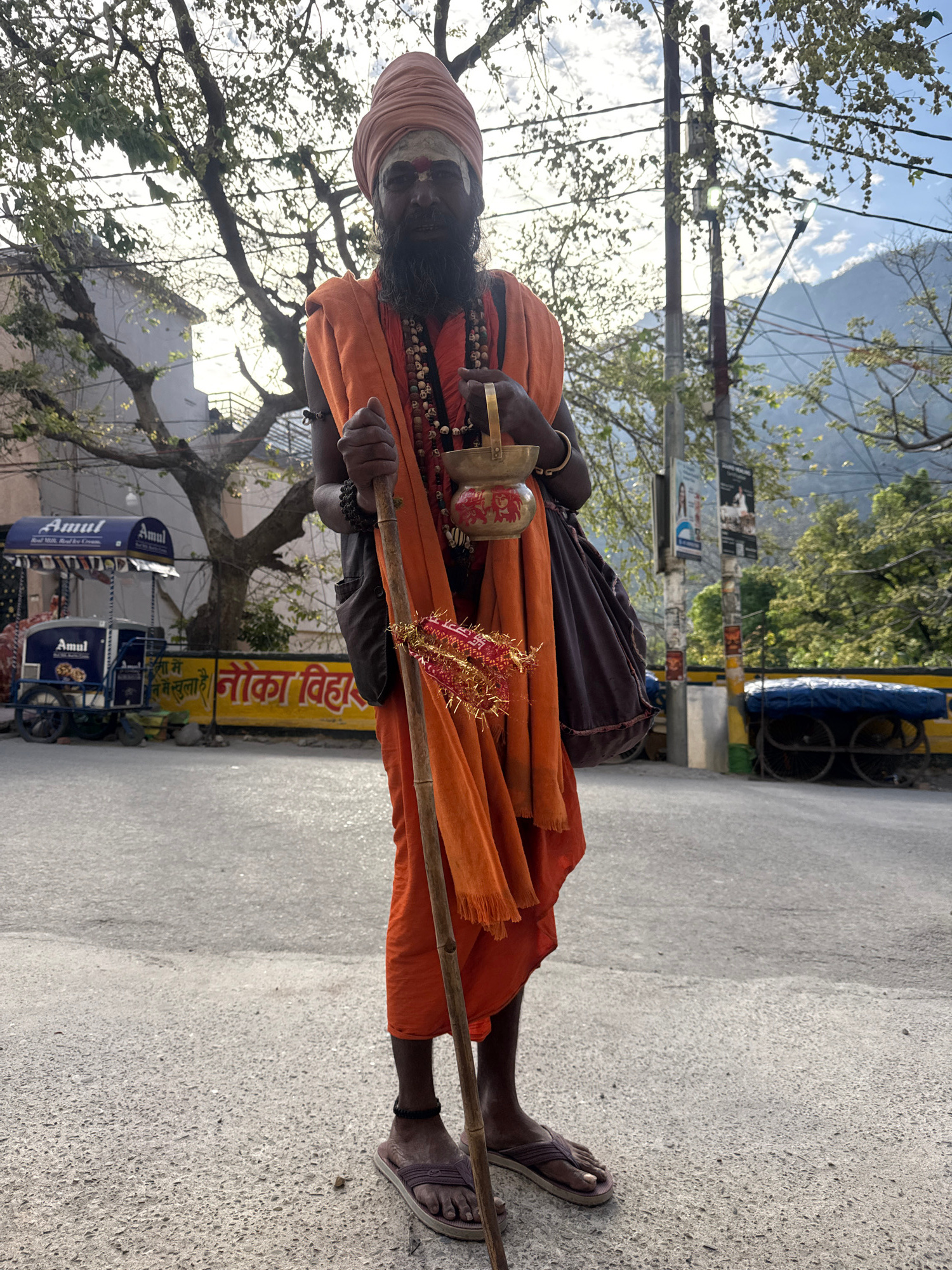 An eye-level, medium outdoor shot shows an Indian sadhu (holy man) standing on a concrete sidewalk in Rishikesh, India. He faces slightly to the left. The sadhu wears a turban and an orange robe. He h…read more