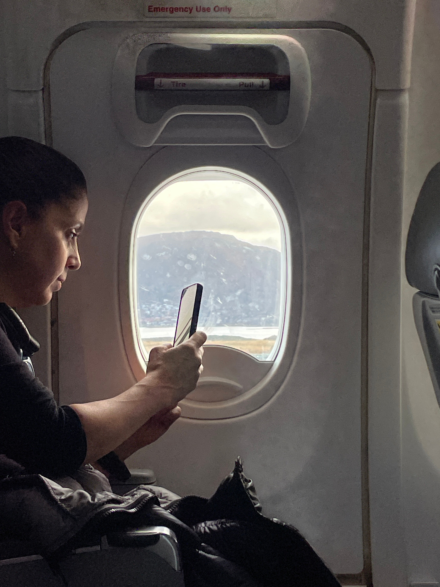 An indoor, eye-level shot captures a person inside an airplane cabin, attentively focusing on the view outside a window. The subject, a person with dark hair, is seen in profile from the chest up, pos…read more