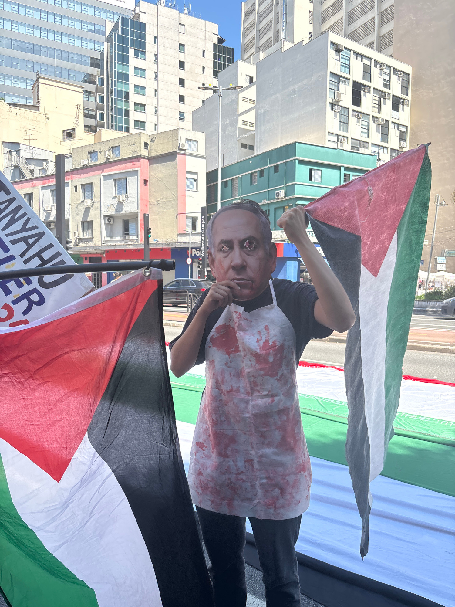 A protester stands in front of a backdrop composed of a Palestinian flag and another flag that reads "Netanyahu = Hitler." The individual wears a mask with the likeness of Israeli Prime Minister Benja…read more