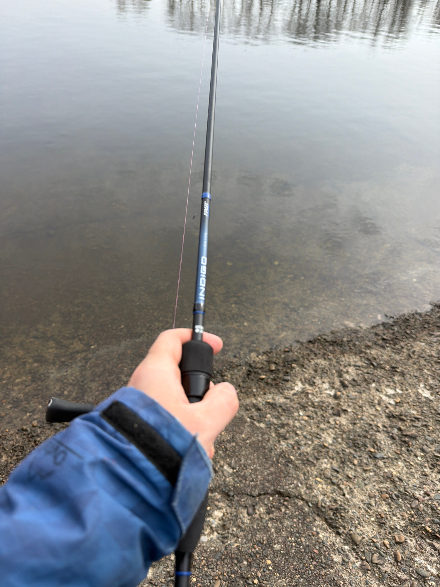 A first-person view shows an individual holding a fishing rod, standing near the edge of a body of water. The fishing rod is dark, with blue accents and the word "INDIGO" printed on its side. A thin,…read more