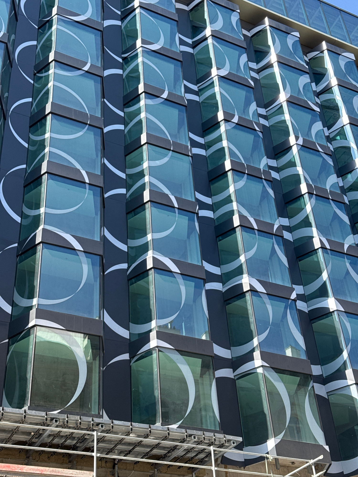 The image shows a close-up view of a modern building with a distinctive facade. The building features a repeating pattern of rectangular glass windows, each offset from the one above and below. A whit…read more