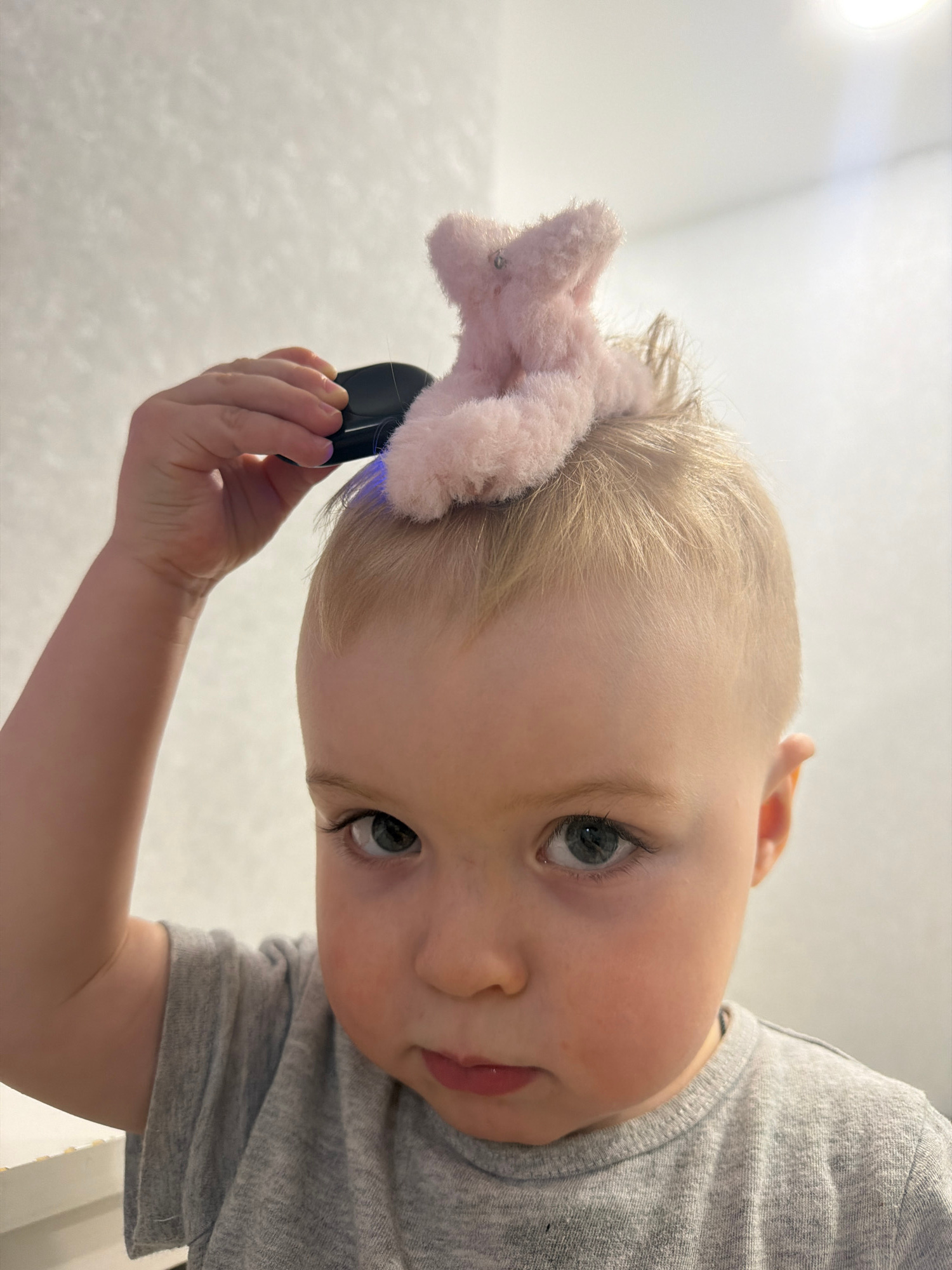 A young child, likely a baby or toddler, is captured in a close-up shot from a low-angle perspective, looking down and directly at the camera. The child has light blonde hair and light-colored eyes, pā¦read more