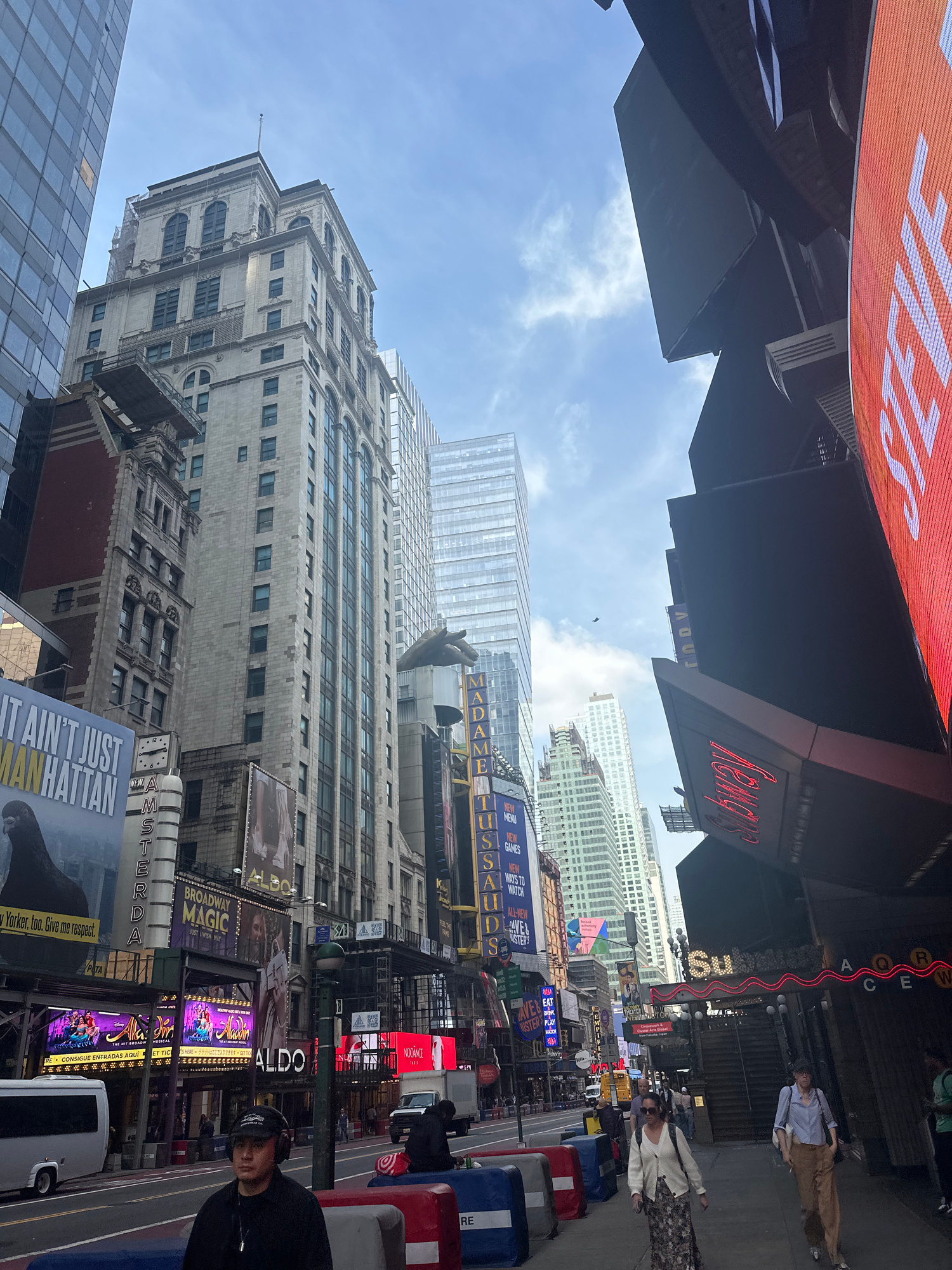 The photograph depicts a street scene in Times Square, New York City. The composition is taken from a low angle, looking upward towards the towering buildings and digital billboards that characterize…read more