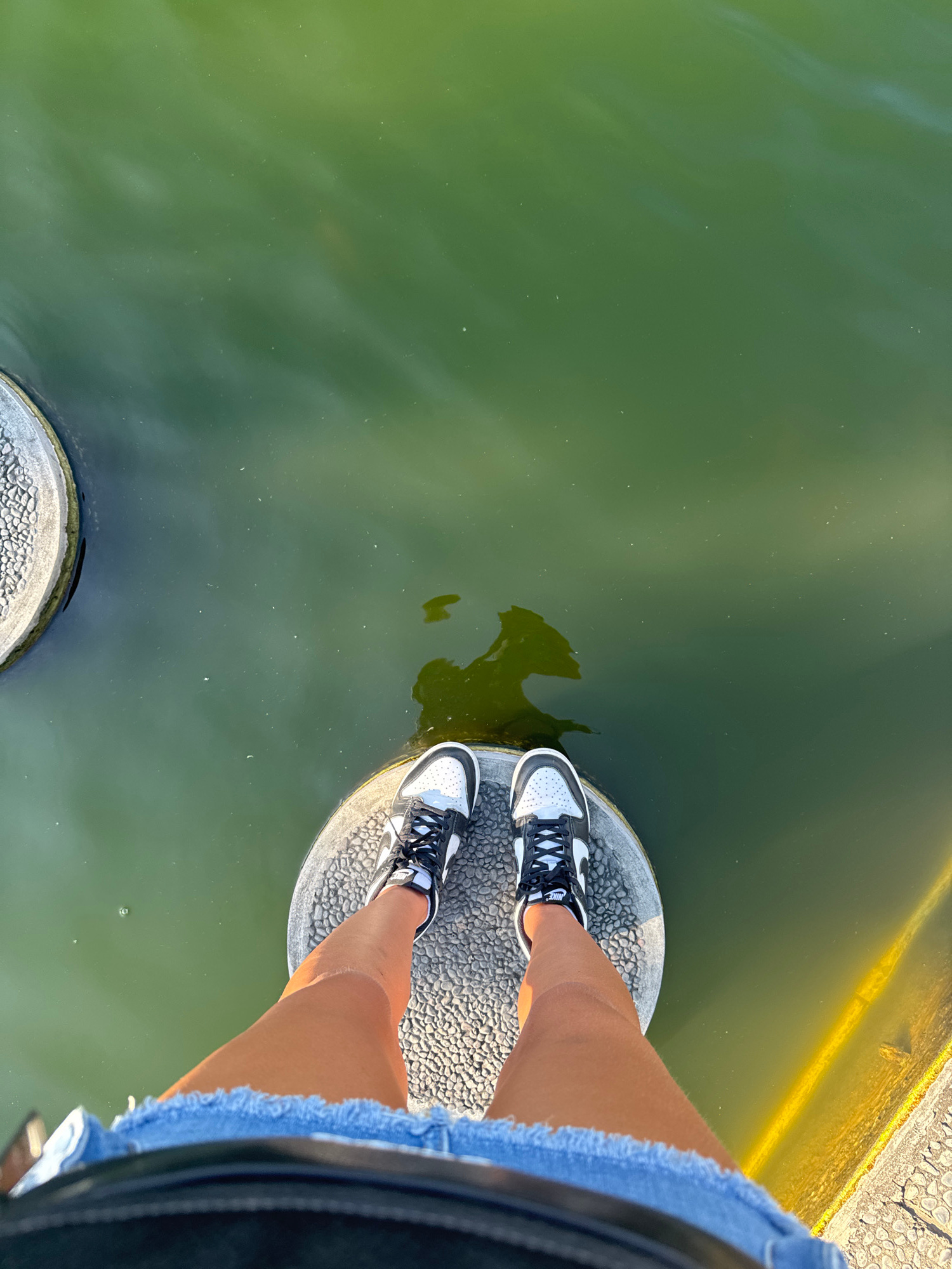 An overhead photograph captures a person's legs and feet as they stand on two circular, textured stone platforms situated in a body of green-tinted water. The person is wearing black and white Nike sn…read more