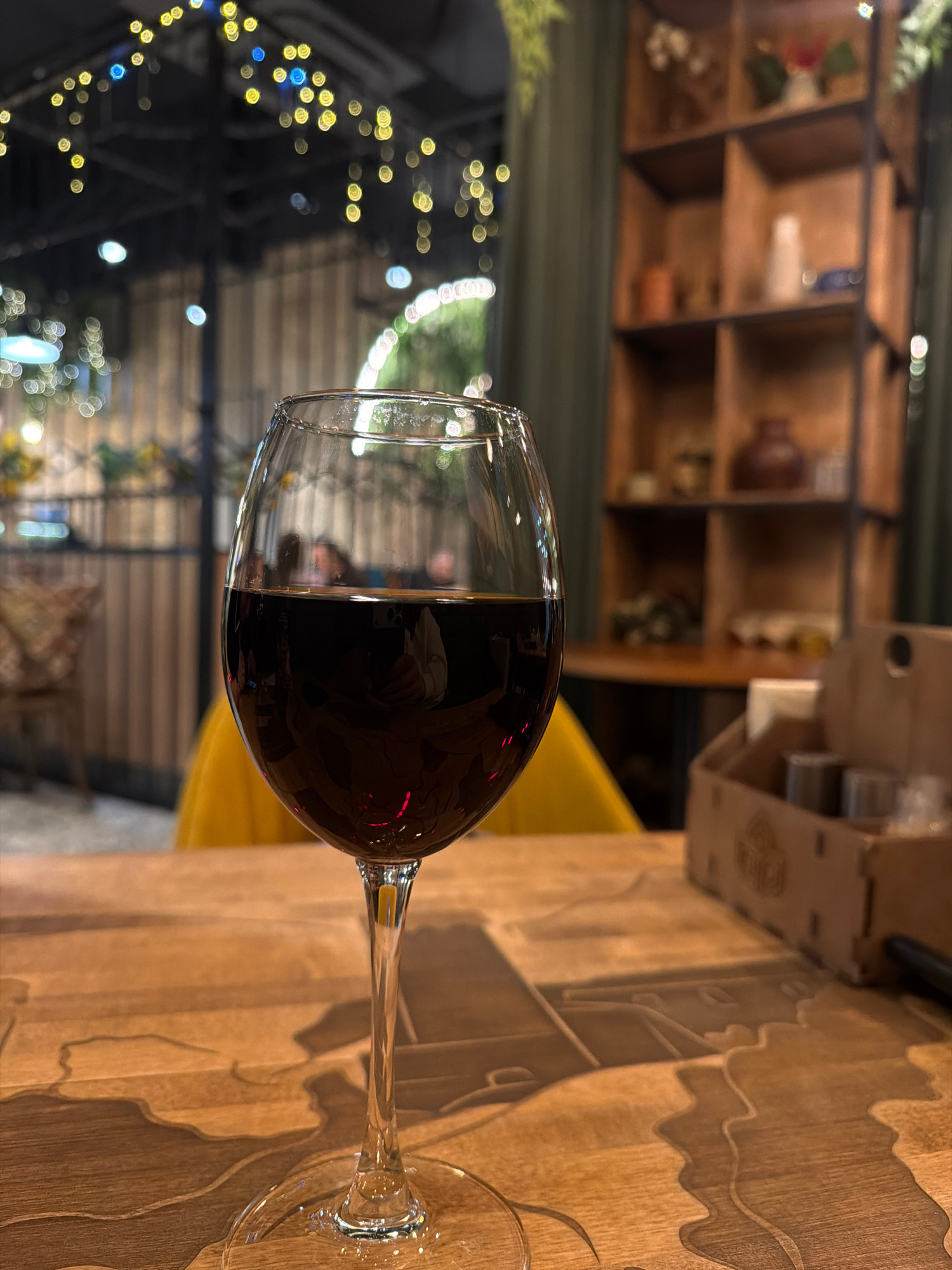 A close-up, slightly blurry, high-angle shot depicts a partially filled wine glass resting on a light brown wooden table. The liquid inside the glass appears to be red wine. The table has a patterned…read more