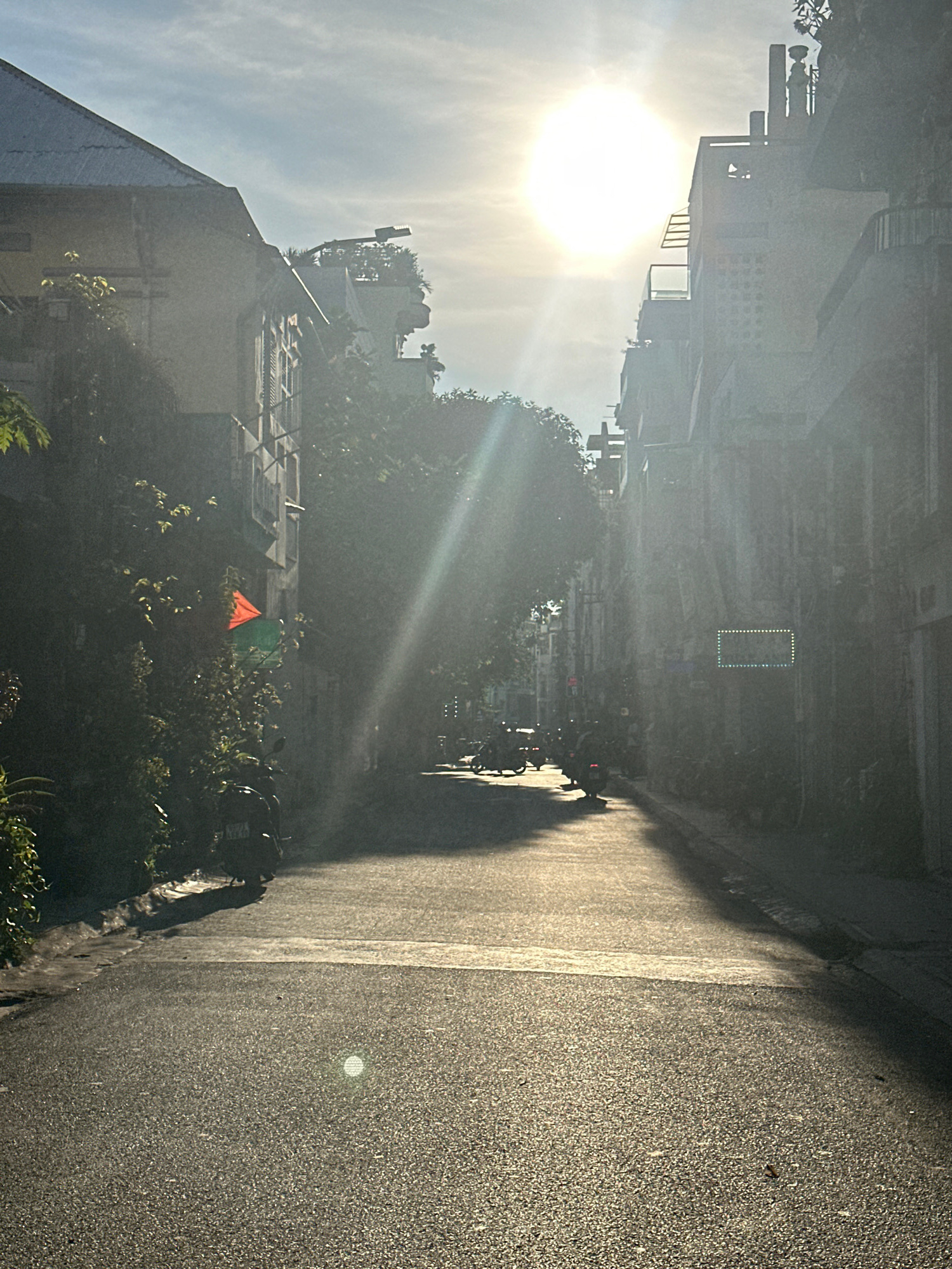 The image depicts a narrow, asphalt street in an urban area of Thủ Đức, Vietnam, under strong backlighting from a high, hazy sun. The perspective is directed down the street, with sunlight creating si…read more