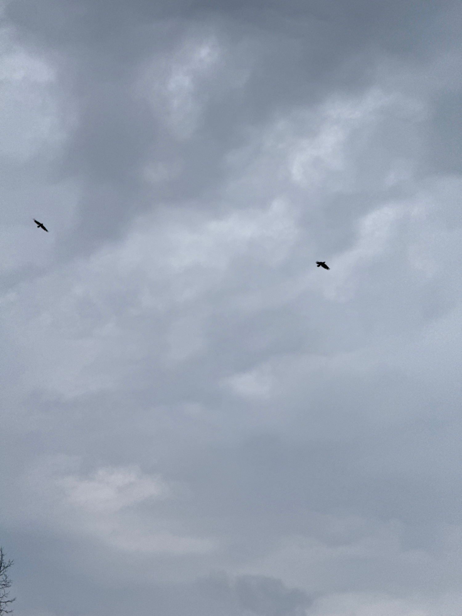 The scene is a sky filled with overcast clouds, appearing gray and textured. Two birds, silhouetted against the bright sky, are in flight. One bird is positioned in the upper center of the frame, andβ¦read more
